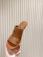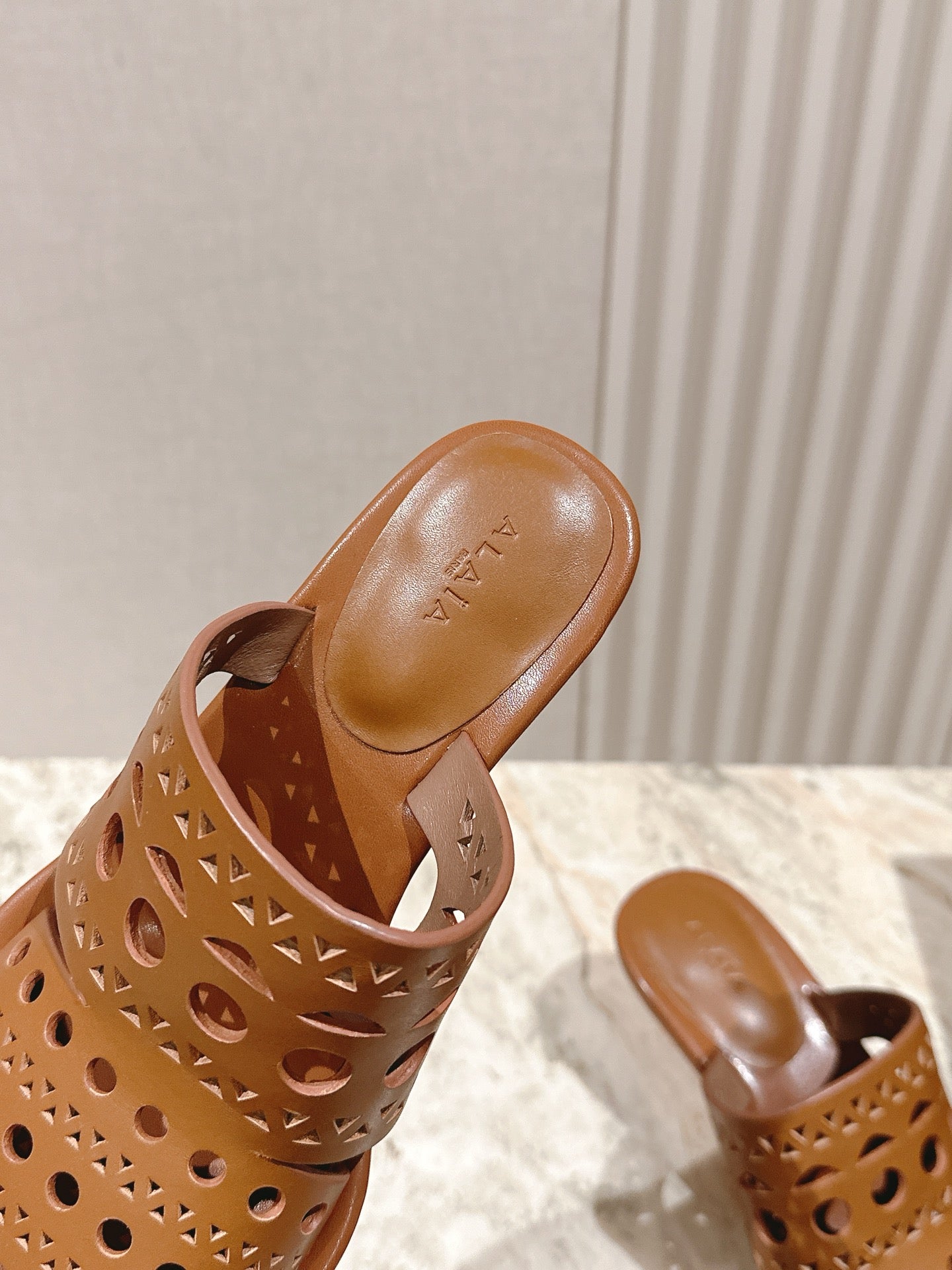 Alaia 2025 Vienne Cutout Kitten-Heel Slide Sandals Brown Leather 293649