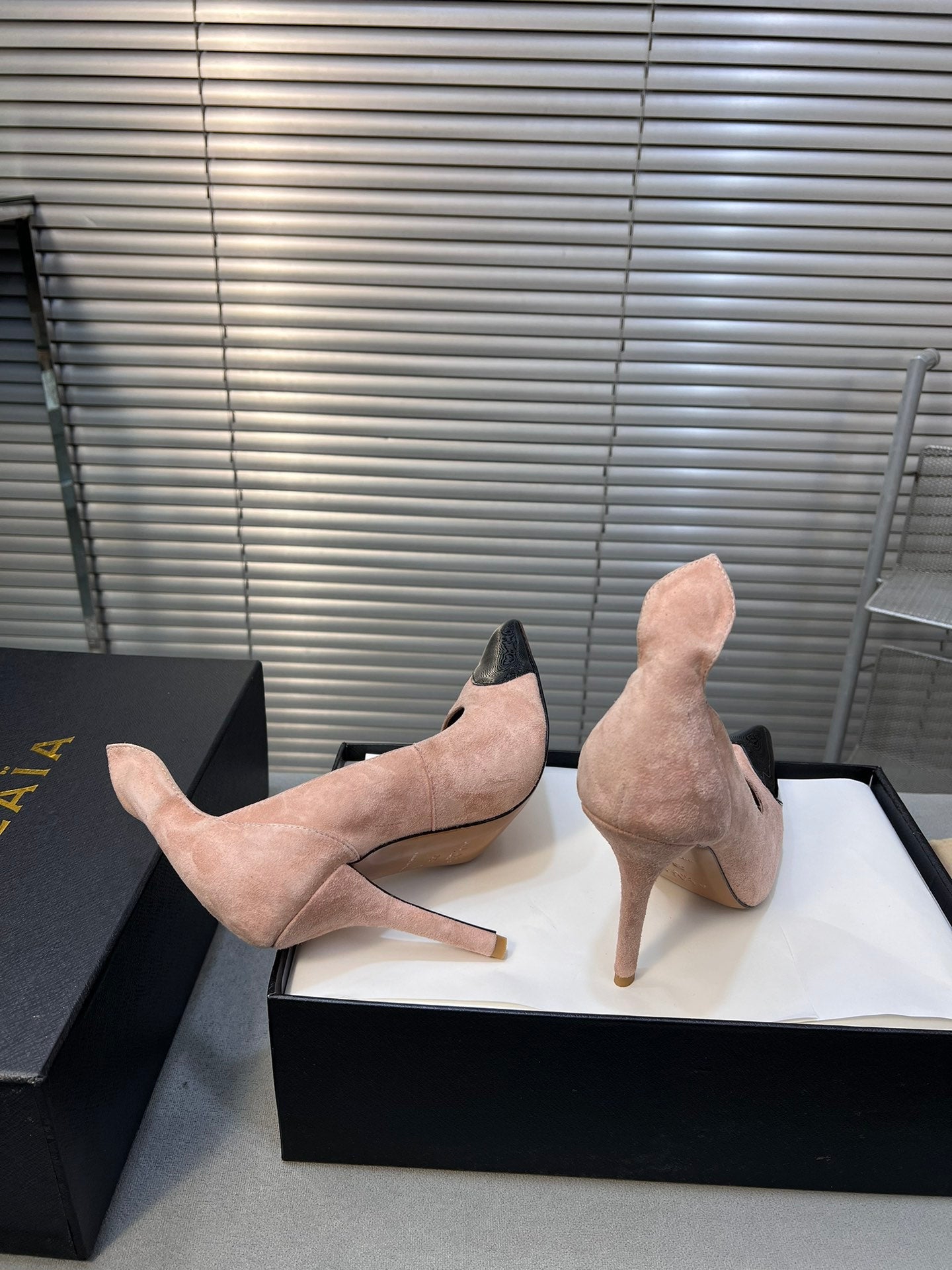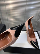 ALAIA HIGH PUMPS 10CM IN ALMOND BEIGE SUEDE MIX BLACK CALFSKIN