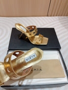 ALAIA TWO-STRAPS HIGH HEEL SANDALS IN GOLDEN PATENT LAMBSKIN