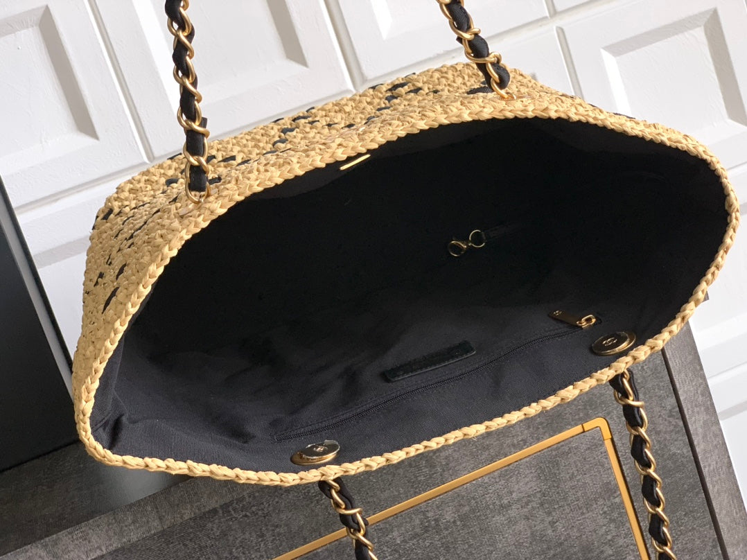 CC Braided Shopping Bag Double C logo Beige Black Raffia