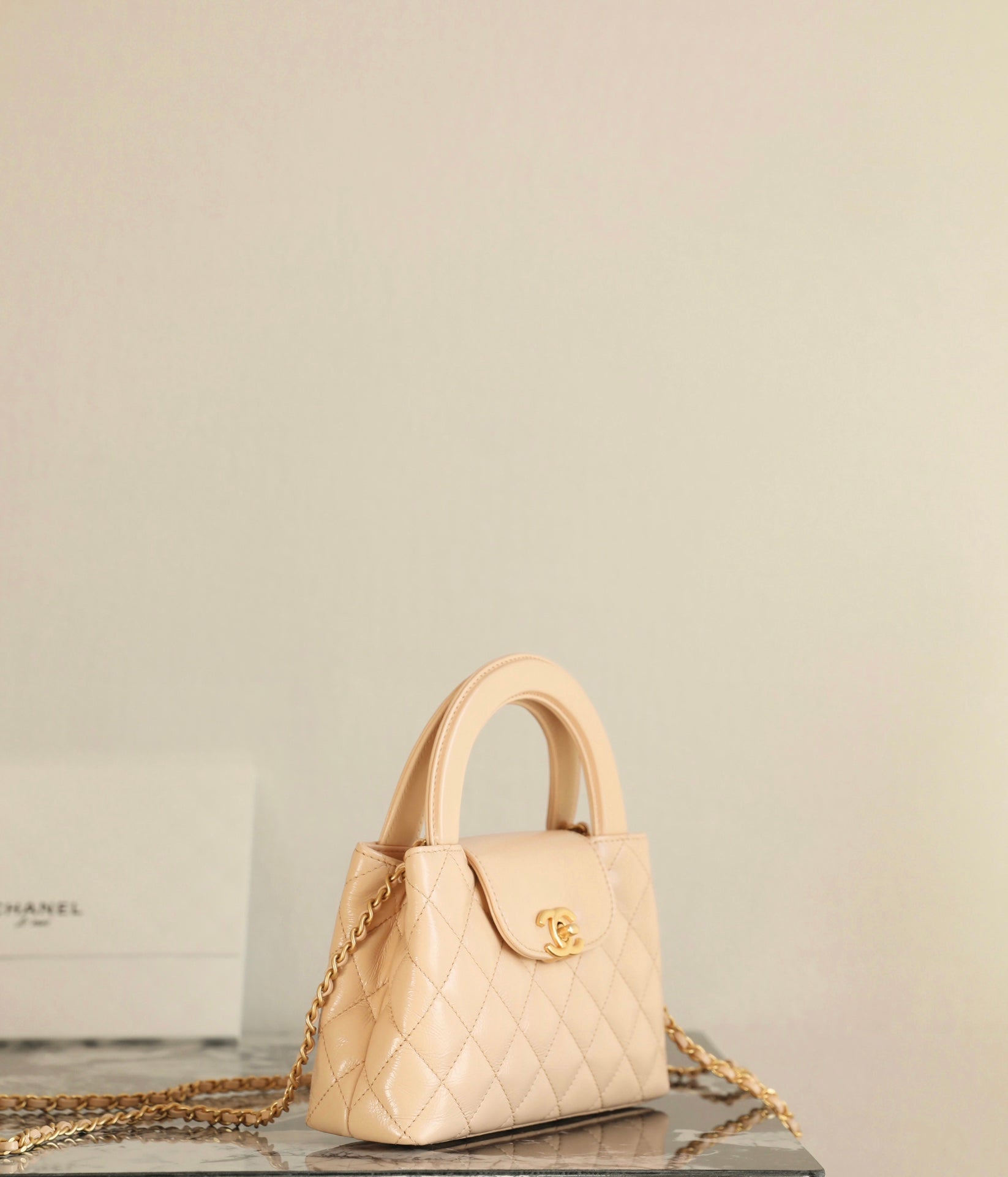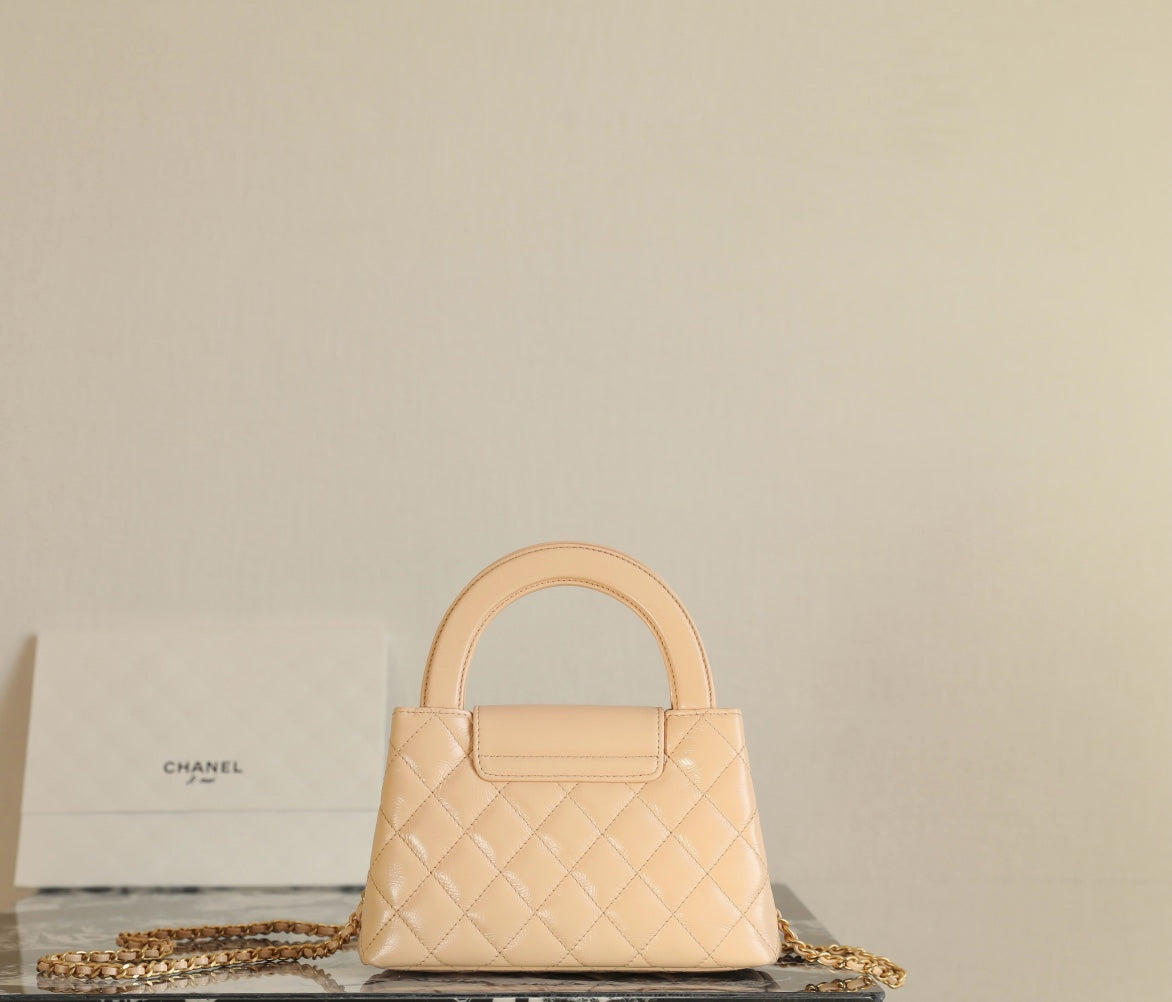 CC 24K Nano 19cm Kelly Shopper Bag Beige Patent Lambskin
