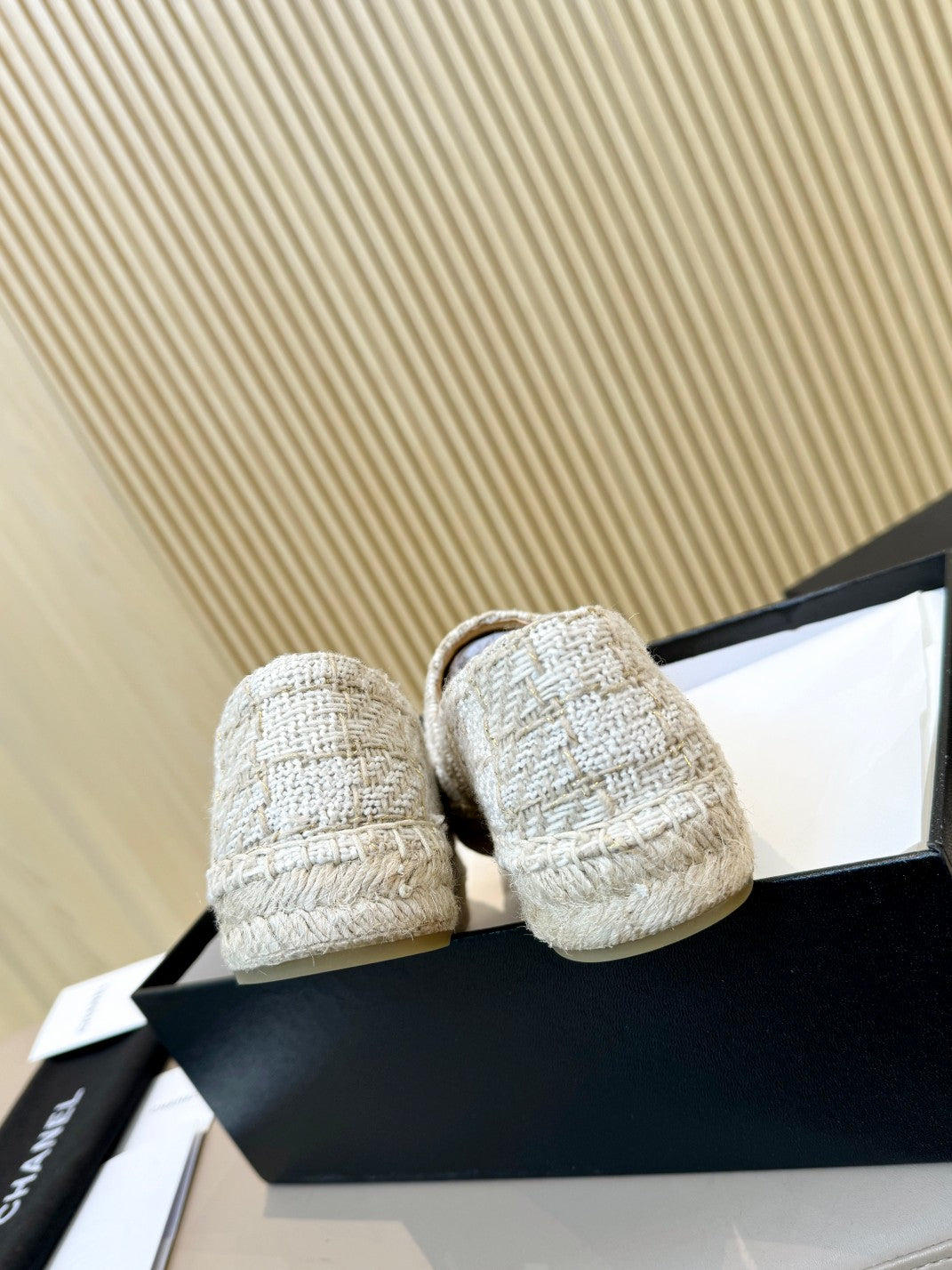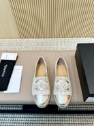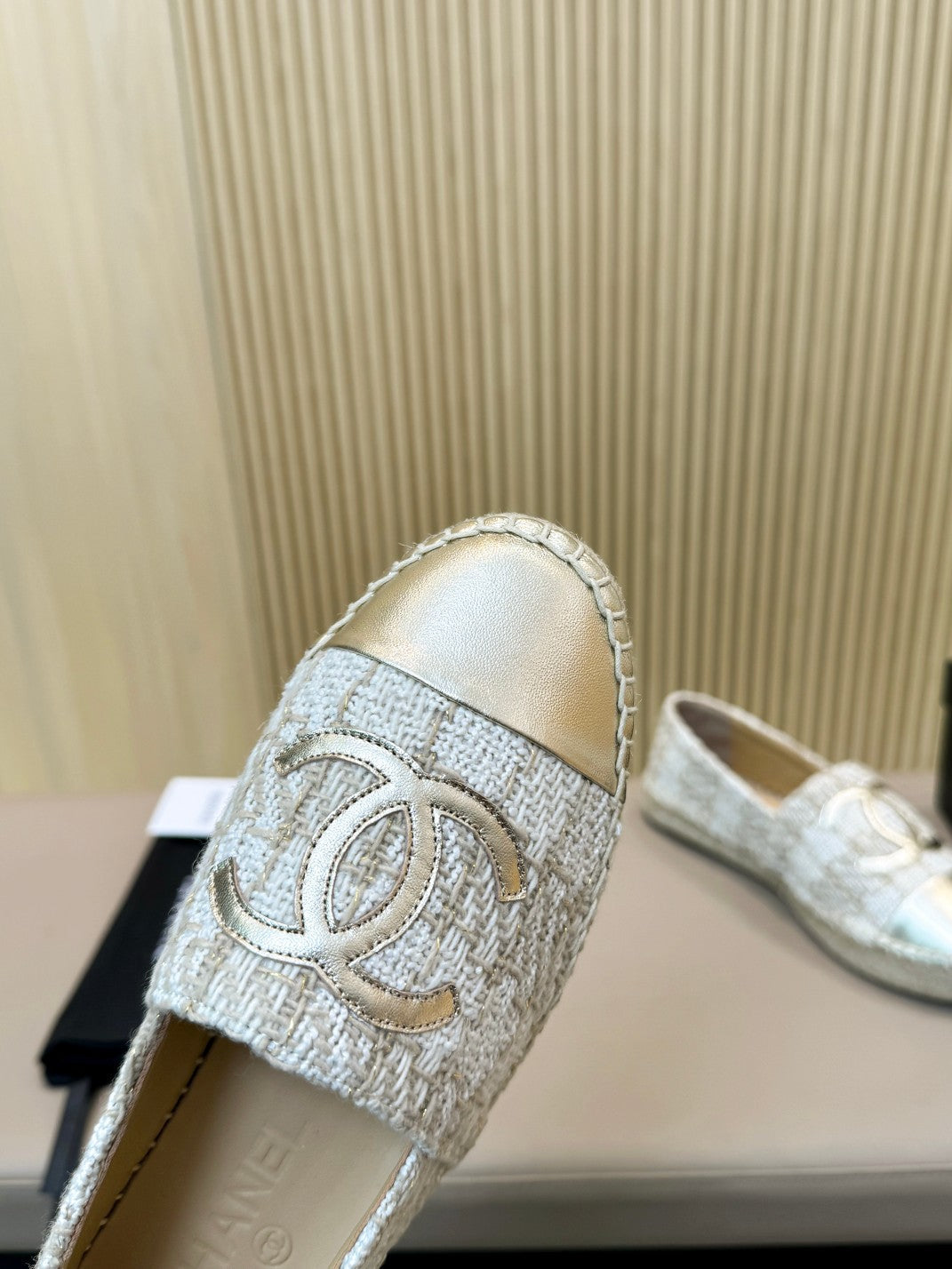 cc espadrilles white brown braided fabric gold metalic calfskin