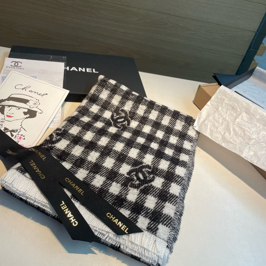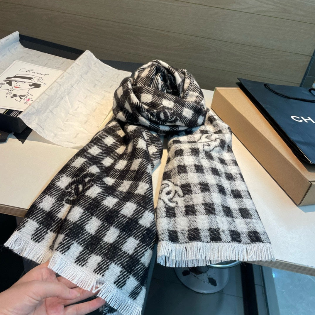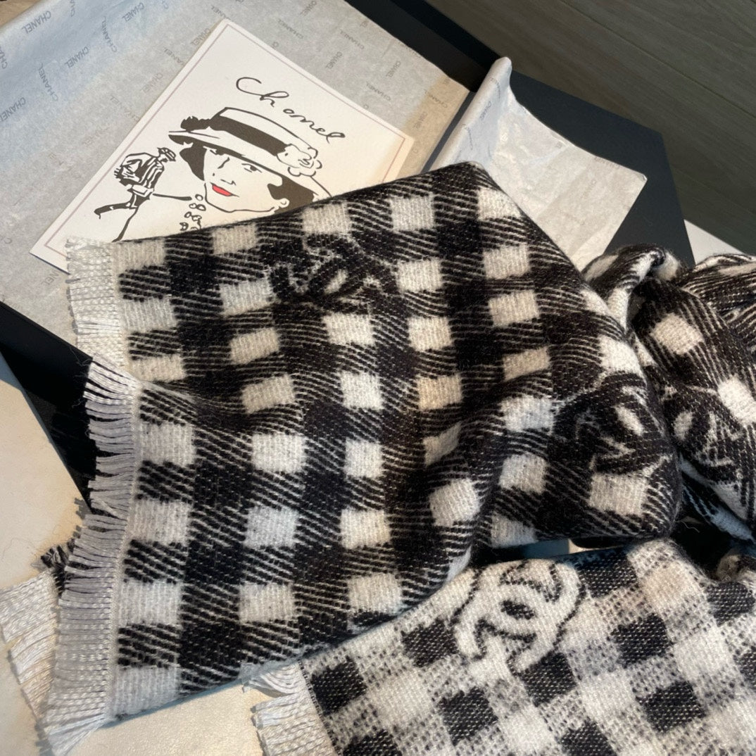 CC Scarf 190 CM In Black And White Plaid Cashmere Mix Wool And Silk 418284