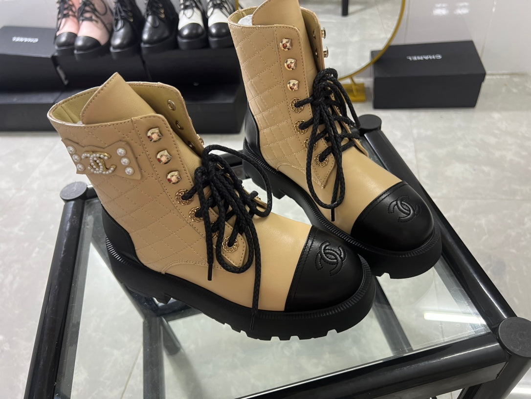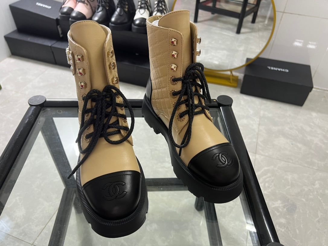 CC Combat Boots Dark Beige Black Quilted Lambskin 944575