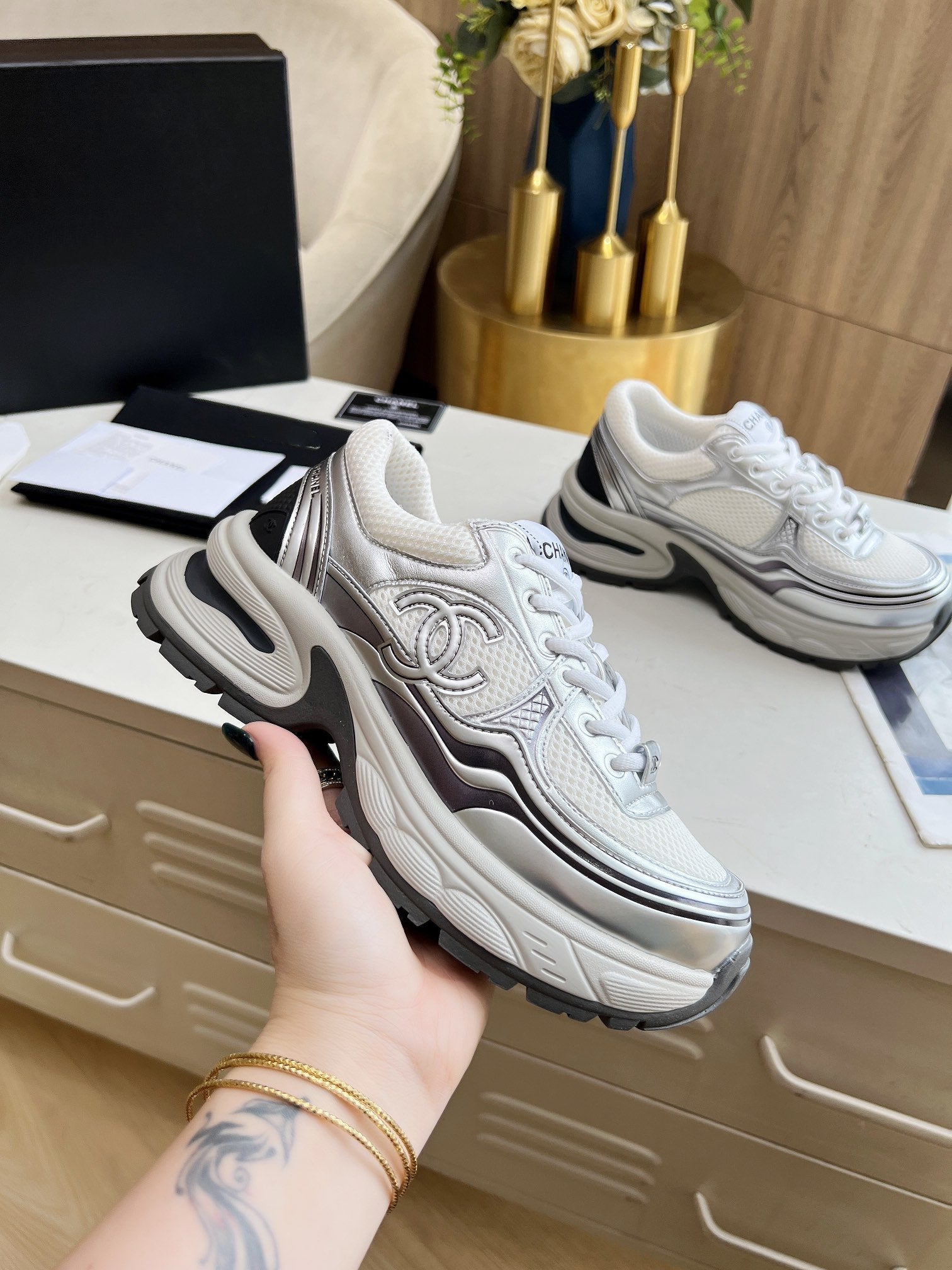cc trainer black calfskin white mesh