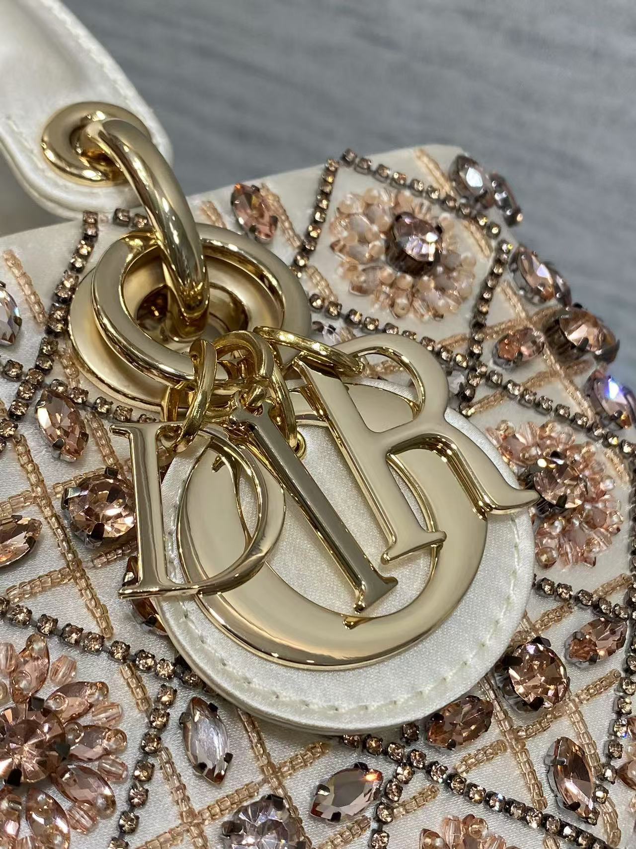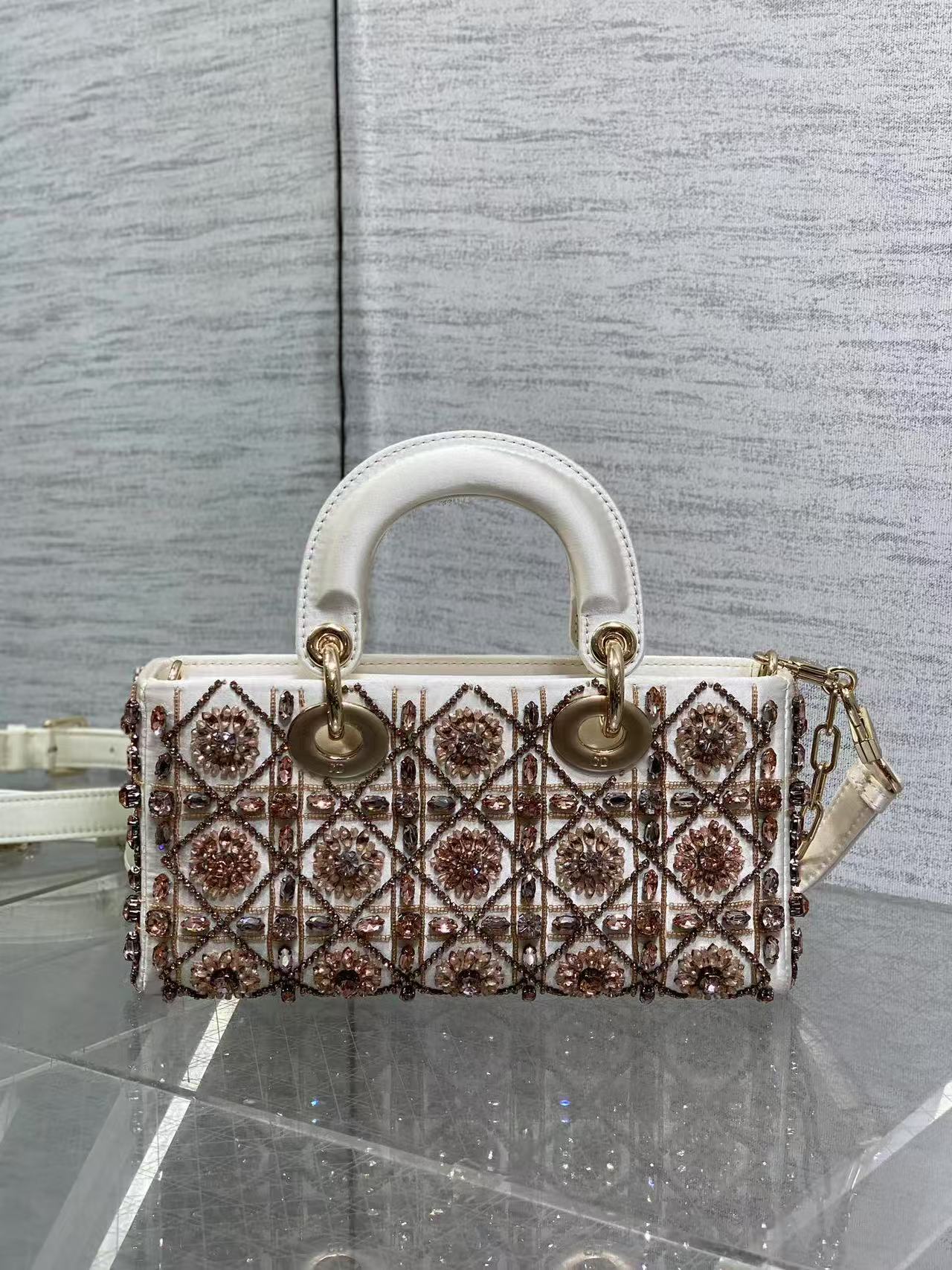 Lady D-Joy Bag 22 White Lambskin Pink Bead Embroidery