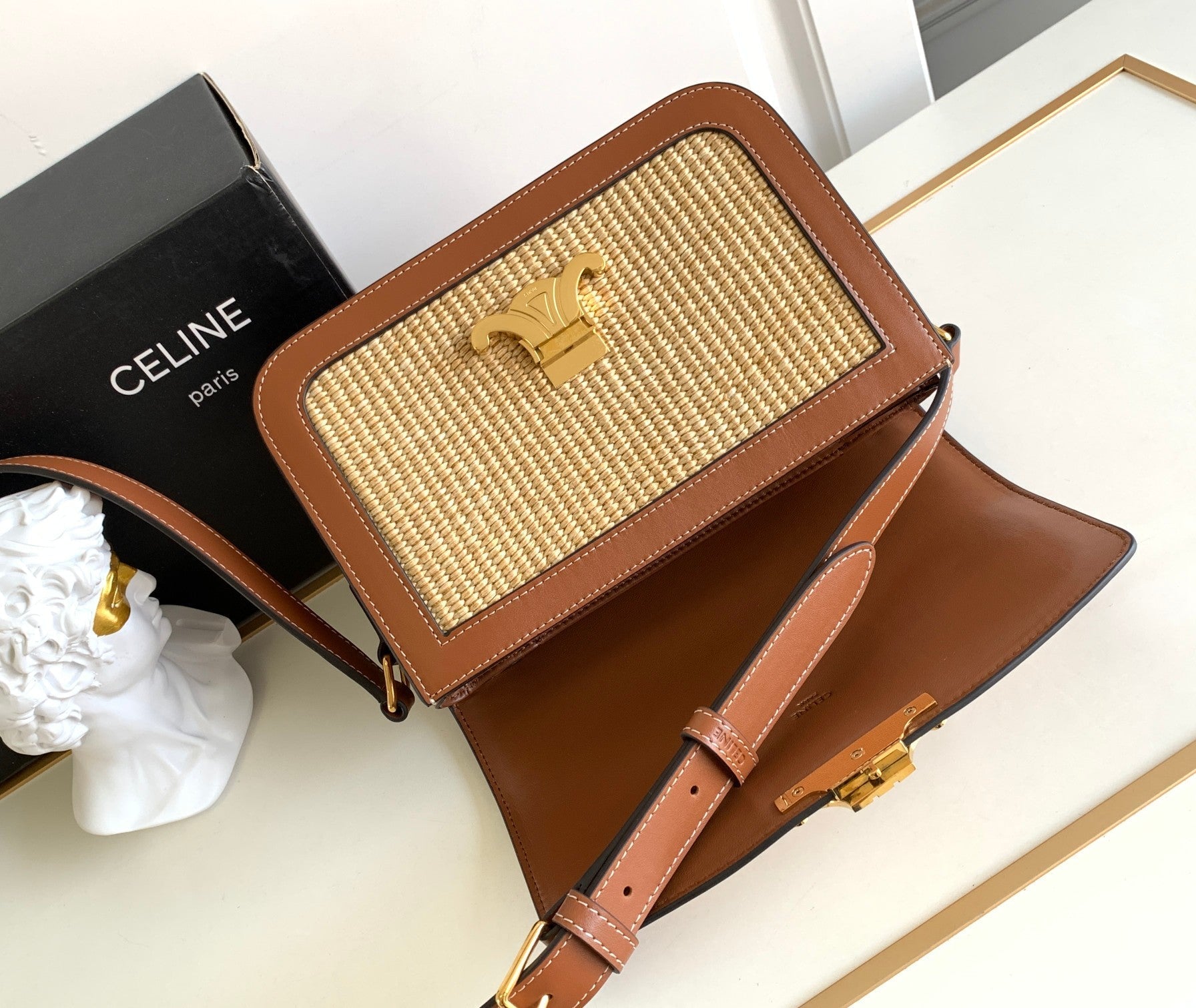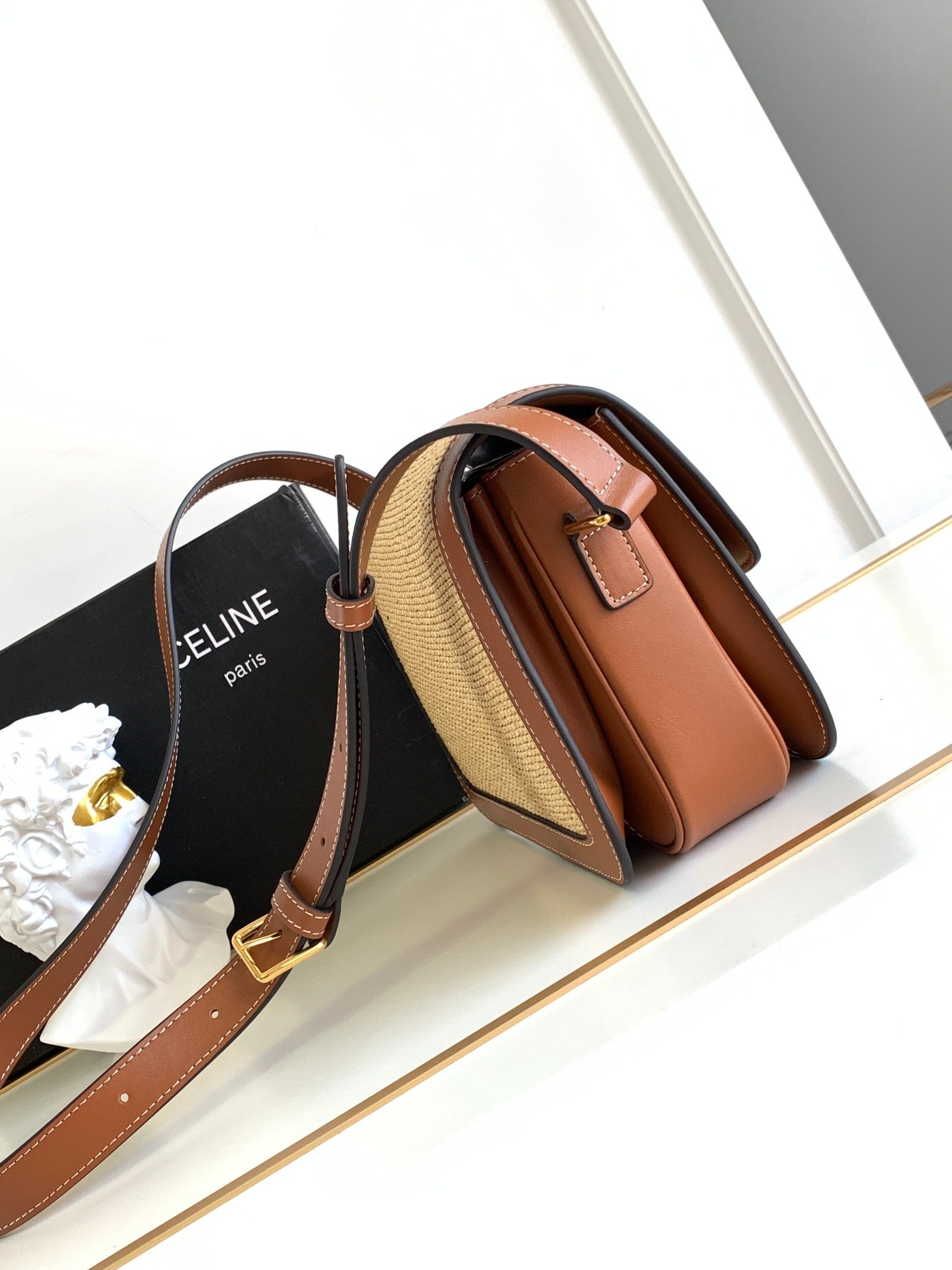 - Color: Beige Textile and Tan leather, Gold hardware