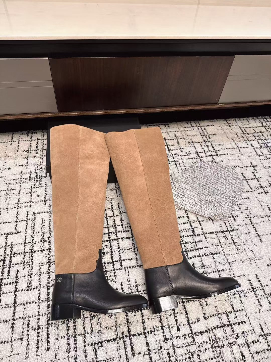 Chanel 25A Winter New Thigh Boots Black Brown Cowhide Mix Suede 393521