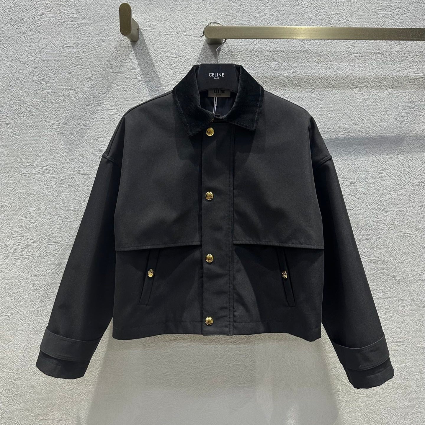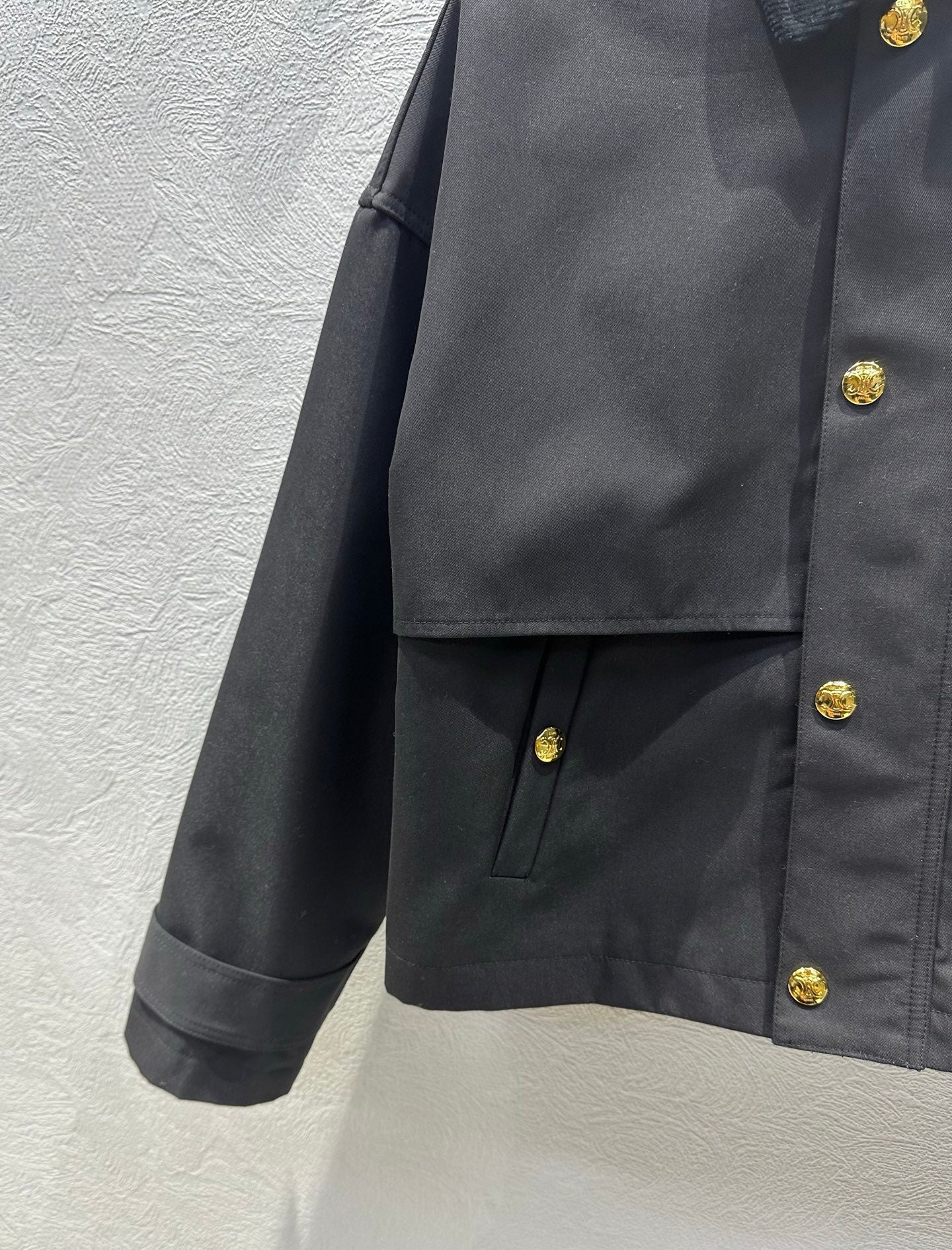 Celine 25 Lapel Short Trench Coat Black Gold Cotton Polyester