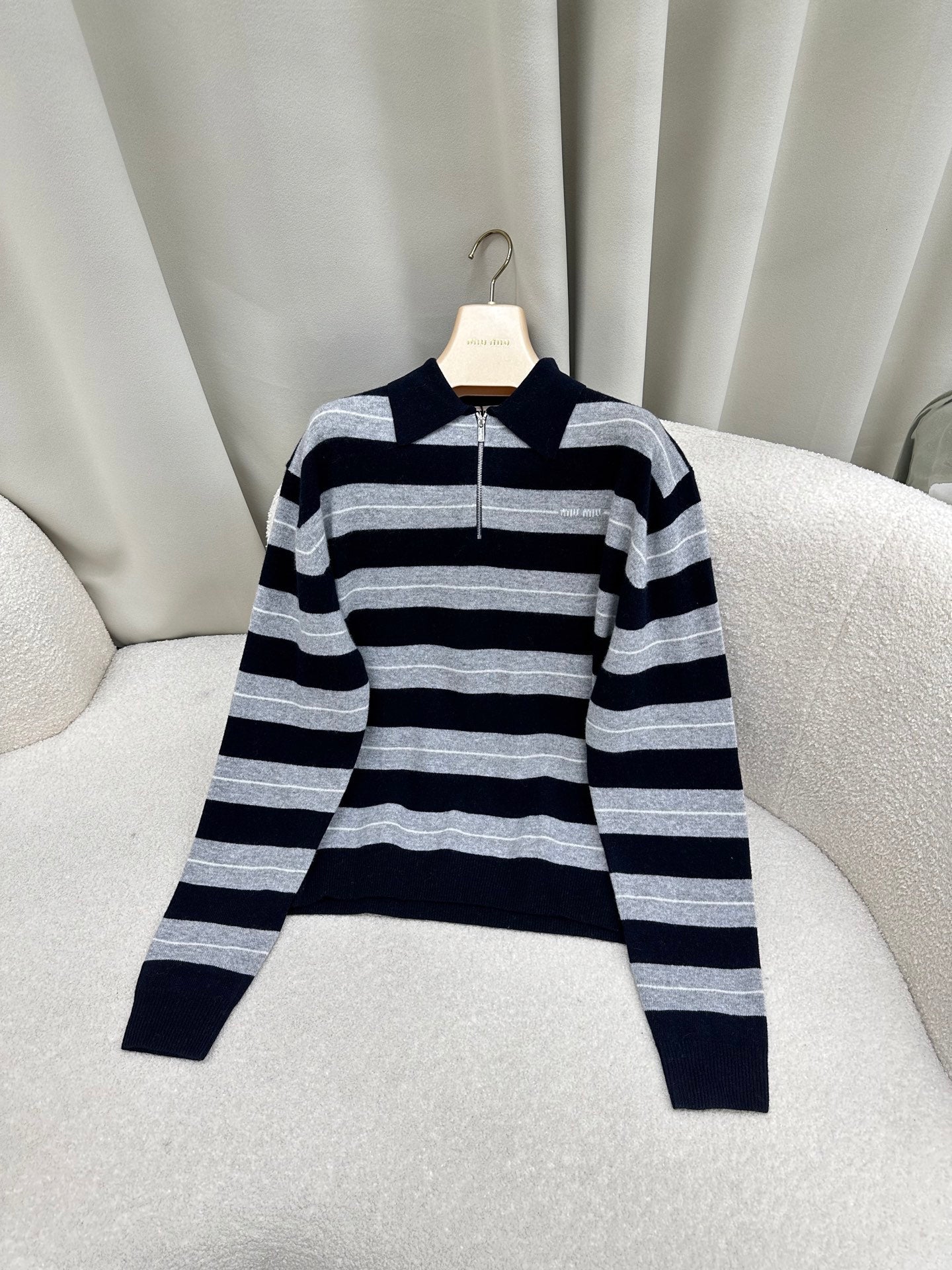 Miu Miu 25 Striped Polo Neck Sweater Navy Blue Gray Cashmere