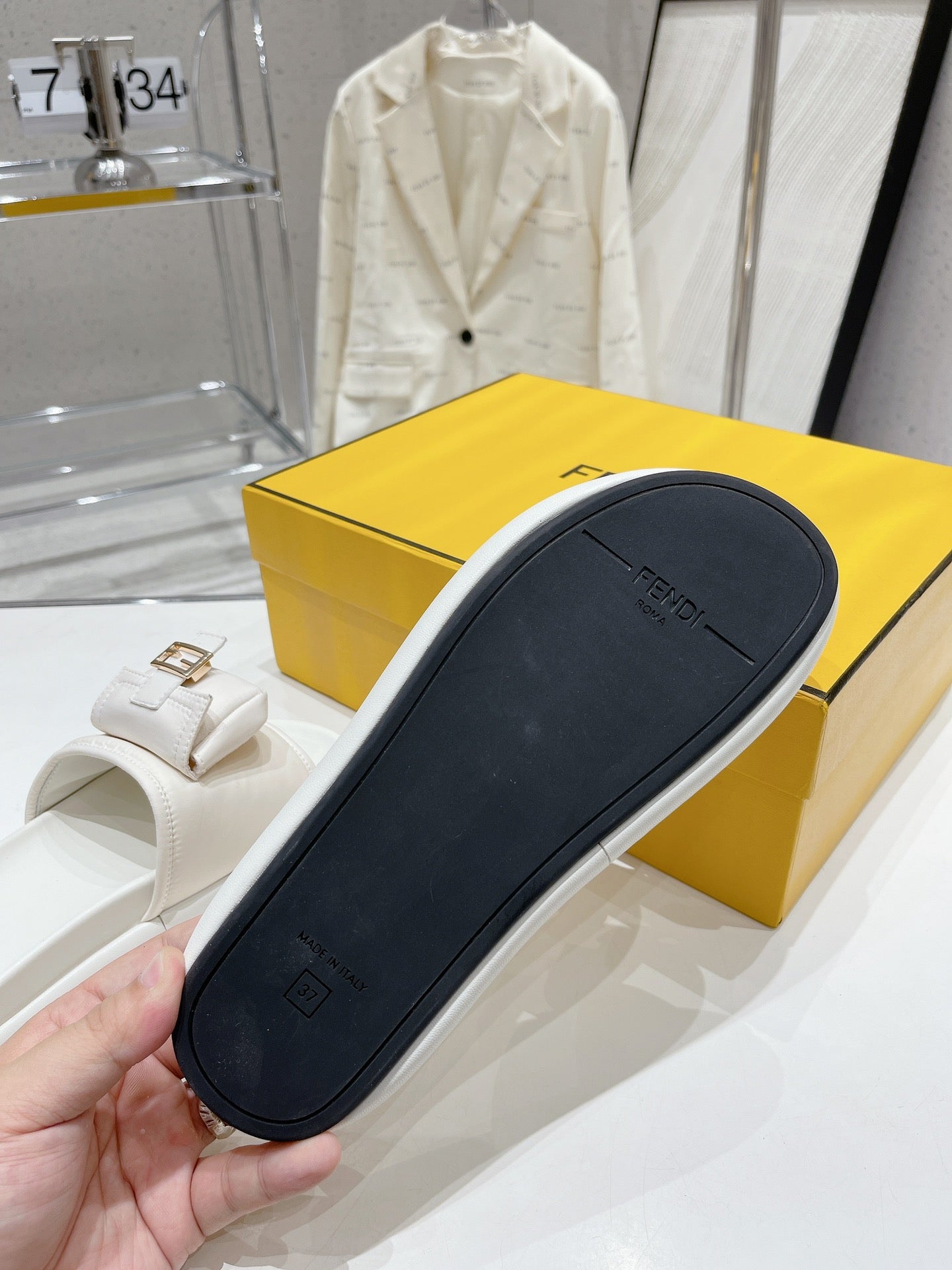 FENDI BAGUETTE SLIPPERS IN WHITE LAMBSKIN WITH GOLD HARDWARE