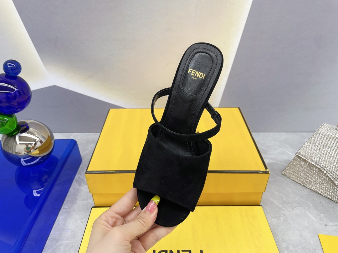 FENDI FIRST 95 MM HIGH-HEELED SANDAL IN BLACK SUEDE GOLD HARDWARE