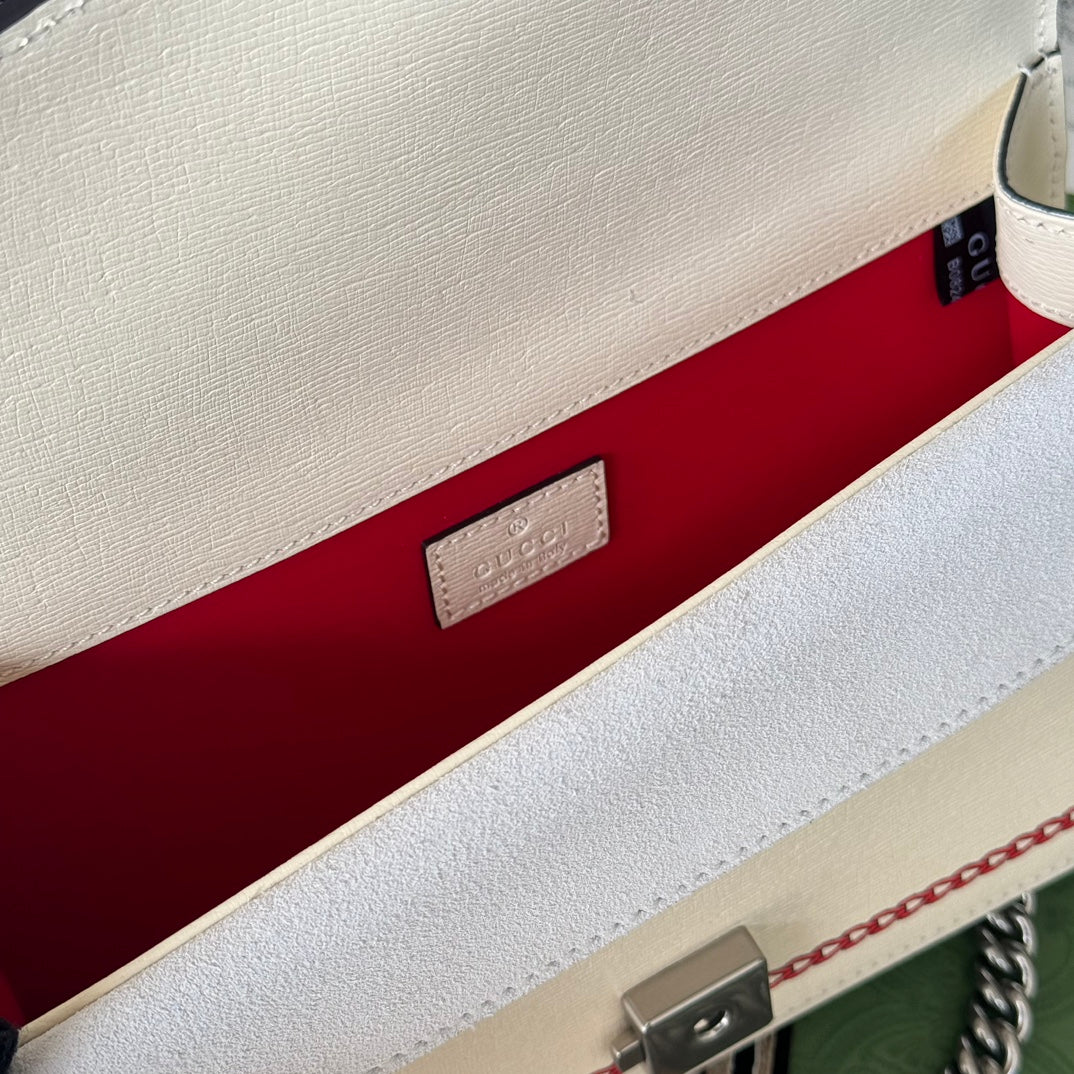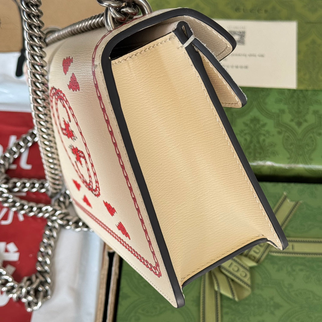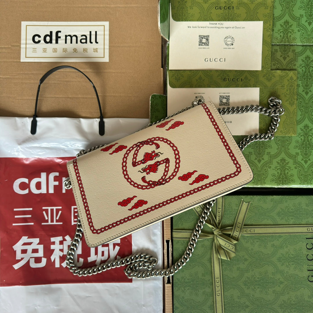 DYONYSUS SMALL SHOULDER BAG 25 IN BEIGE MIX RED CALFSKIN DRAGON LOGO PRINT