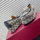 HORSEBIT PLATFORM LOAFER IN TAN BEIGEMONOGRAM JACQUARD FABRIC AND NAVY BLUE CALFSKIN