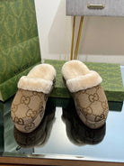 GG MOLLY MULE IN CAMEL BROWN MONOGRAM JACQUARD FABRIC AND SHEARLING LINING