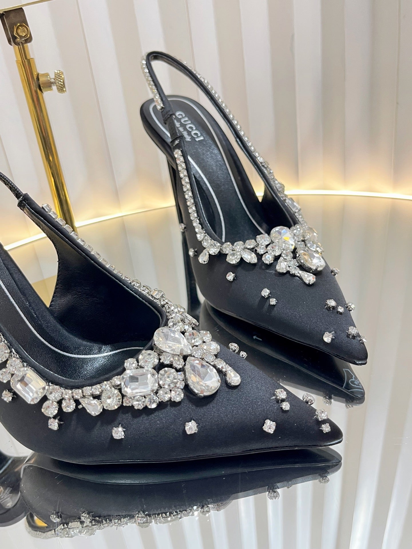 GC 2025 Crystal Embellished High Heels Slingbacks Black Silk Sheepskin 294523