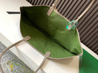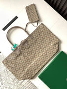 - Material: This St. Louis PM tote is in Greige and Green Goyardine canvas with palladium hardware and features greige leather handles and trim, removable pouch and white stitching.