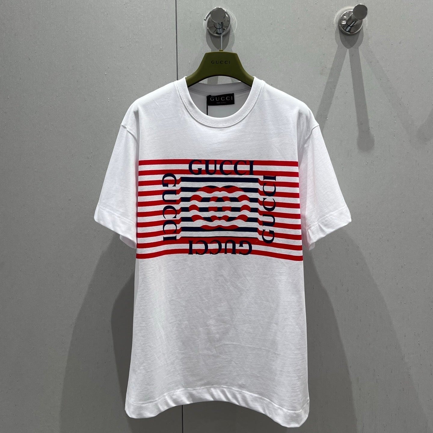 Gucci 25 Striped Logo Print Short-sleeved T-shirt White Red Cotton