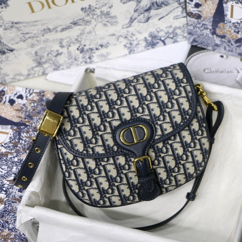 MEDIUM CD BOBBY 22CM BLUE OBLIQUE EMBROIDEDERED CANVAS GOLD HARDWARE