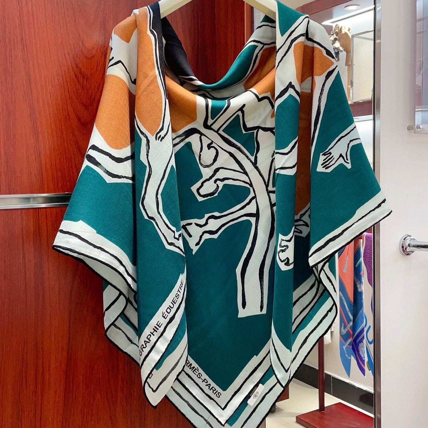 Choregraphie Equestre Scarf 140 CM Teal Blue Colorful Cashmere And Silk 393171