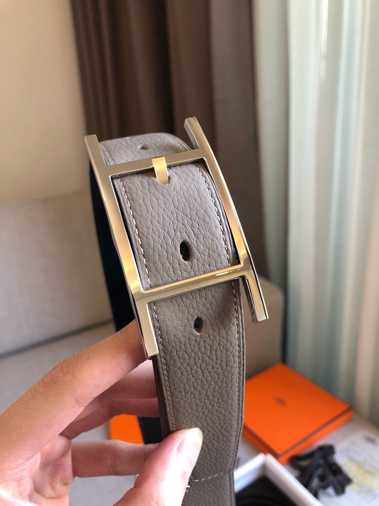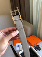 H BELT SILVER BUCKLE GREY BLACK LEATHER REVERSIBLE 3.2CM
