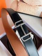 HM ROYAL BELT BUCKLE & REVERSIBLE NOIR AND CIDER ORANGE LEATHER STRAP 32 MM SILVER HARDWARE