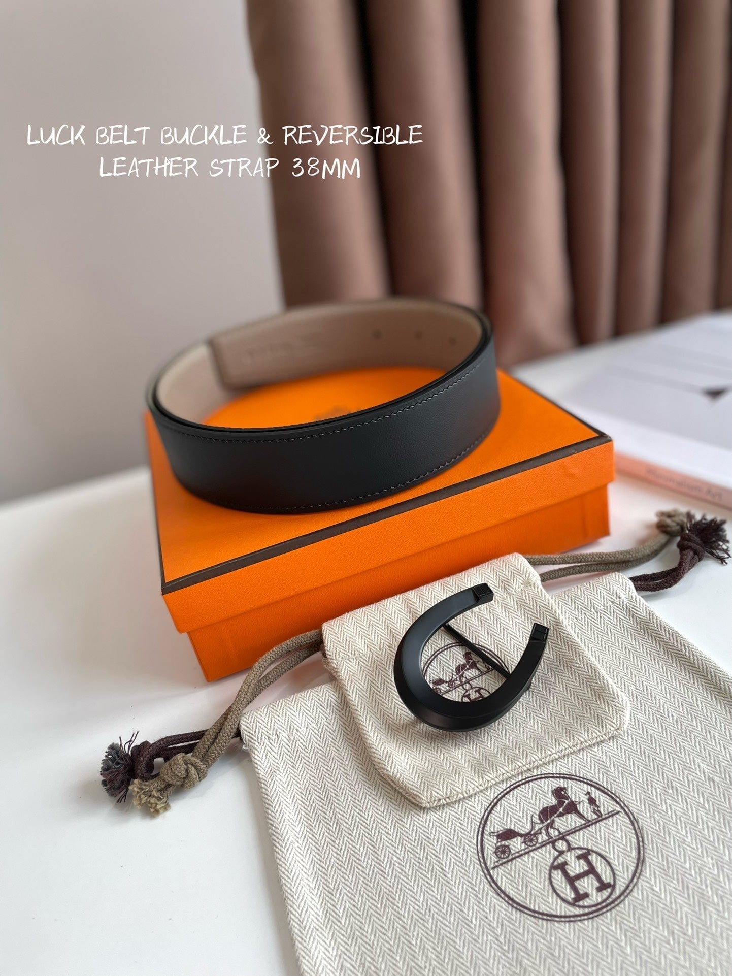 LUCK BELT BUCKLE & REVERSIBLE KHAKI BROWN LEATHER STRAP 38MM BLACK HARDWARE