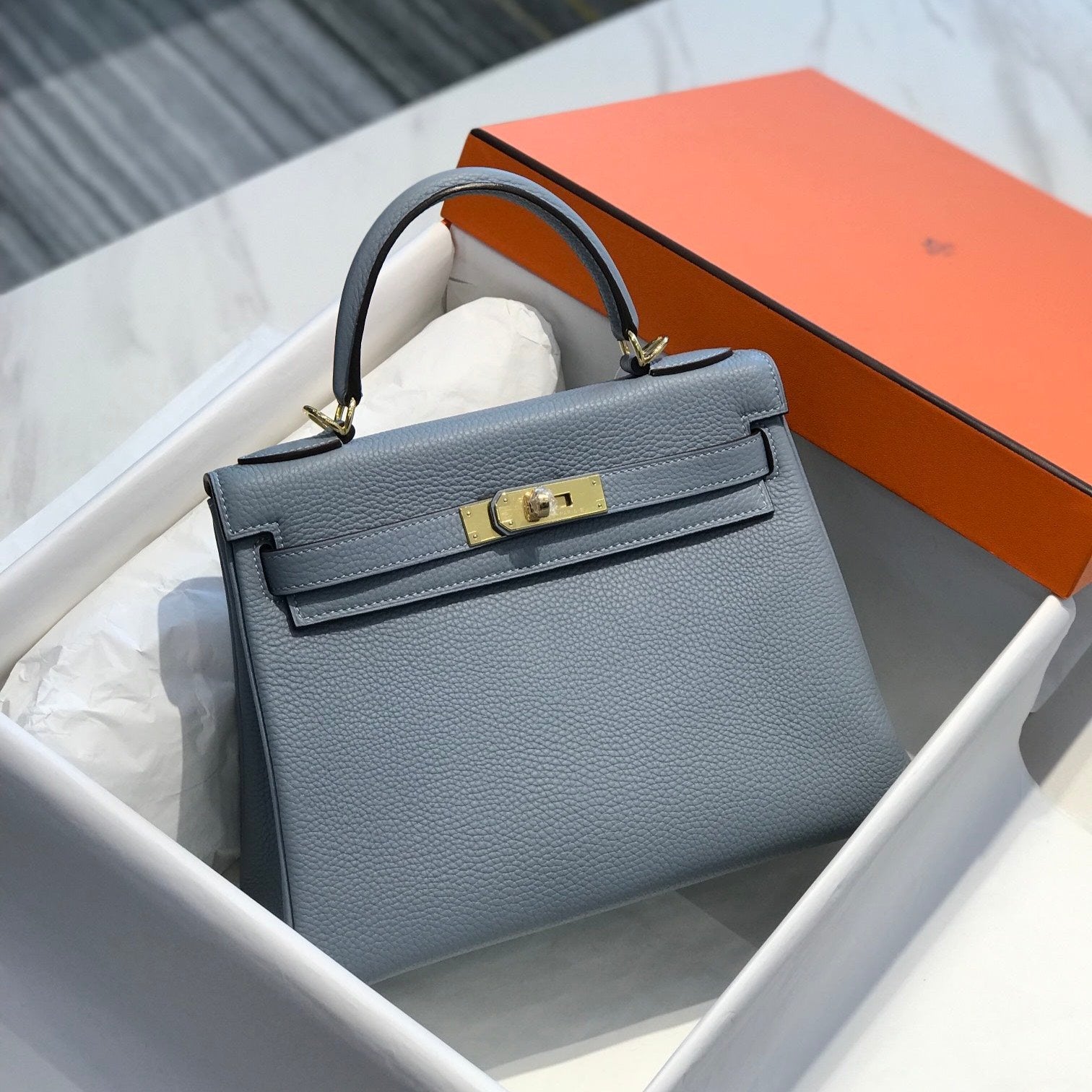 HM KELLY 32CM BAG IN TEMPERED GRAY TOGO GOLD HARDWARE