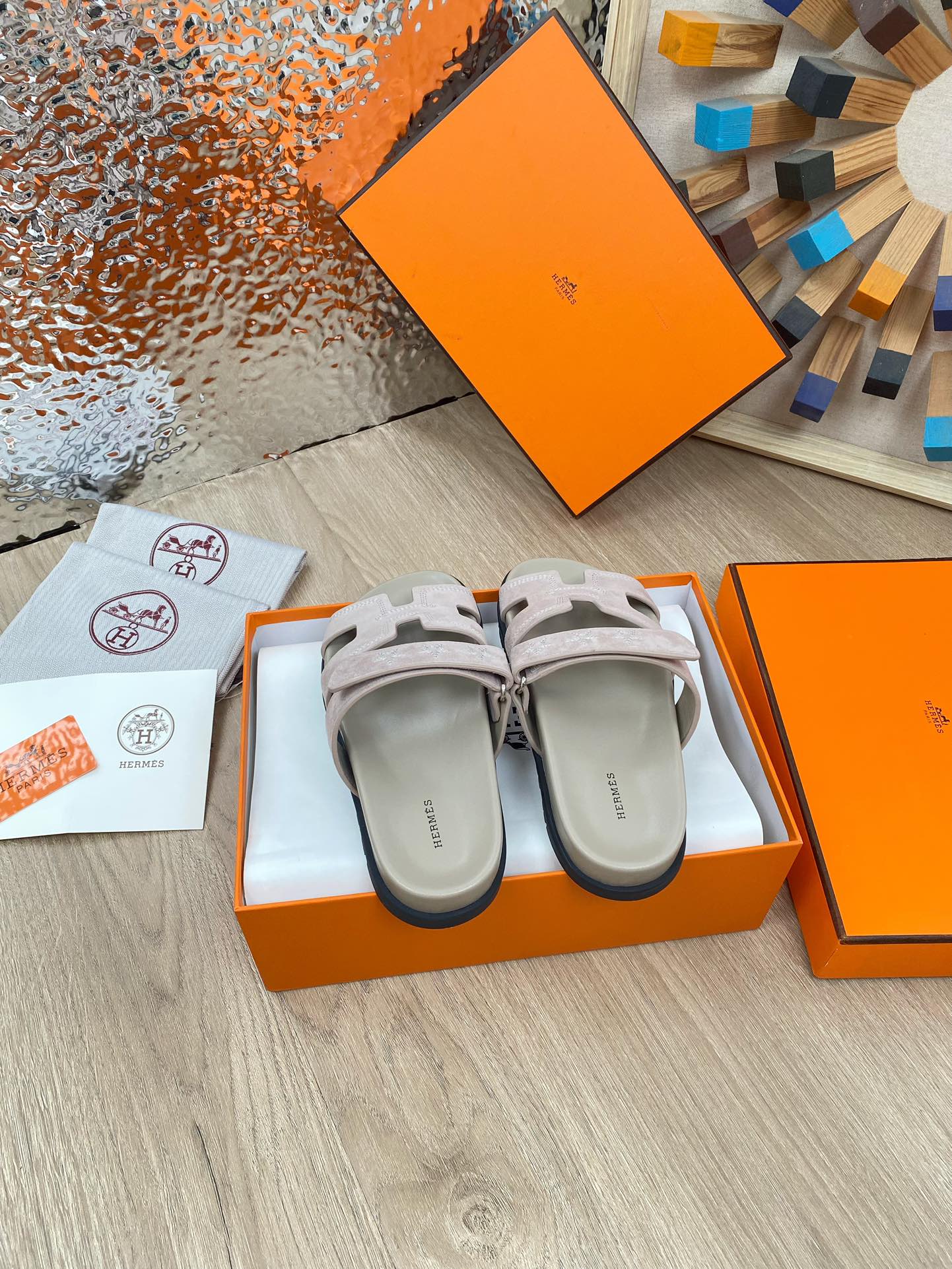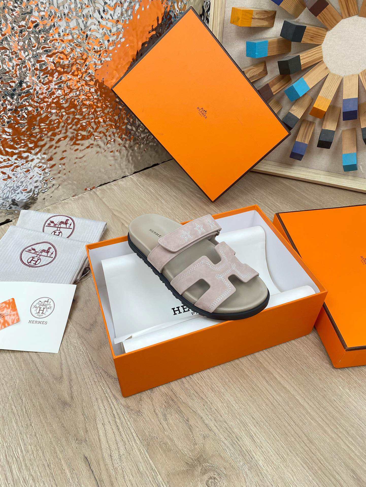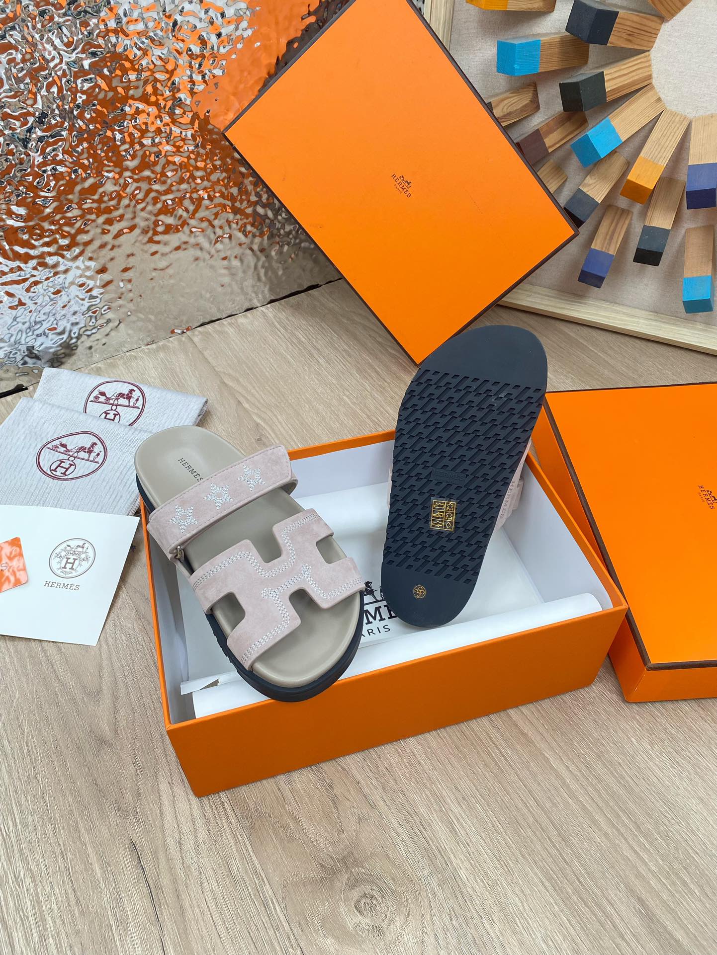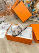 chypre sandal pinkish beige suede calfskin white thread embroidered