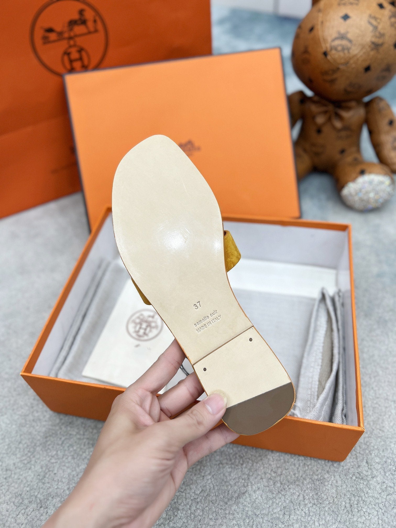 - Material: Sandal in suede goatskin with iconic "H" cut-out.
