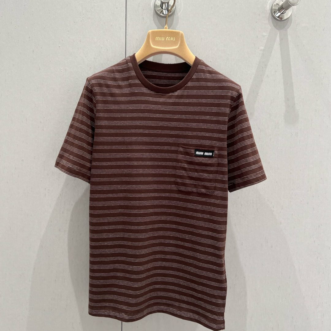 Miu Miu 25 Striped Round Neck Short-sleeved T-shirt Brown Cotton