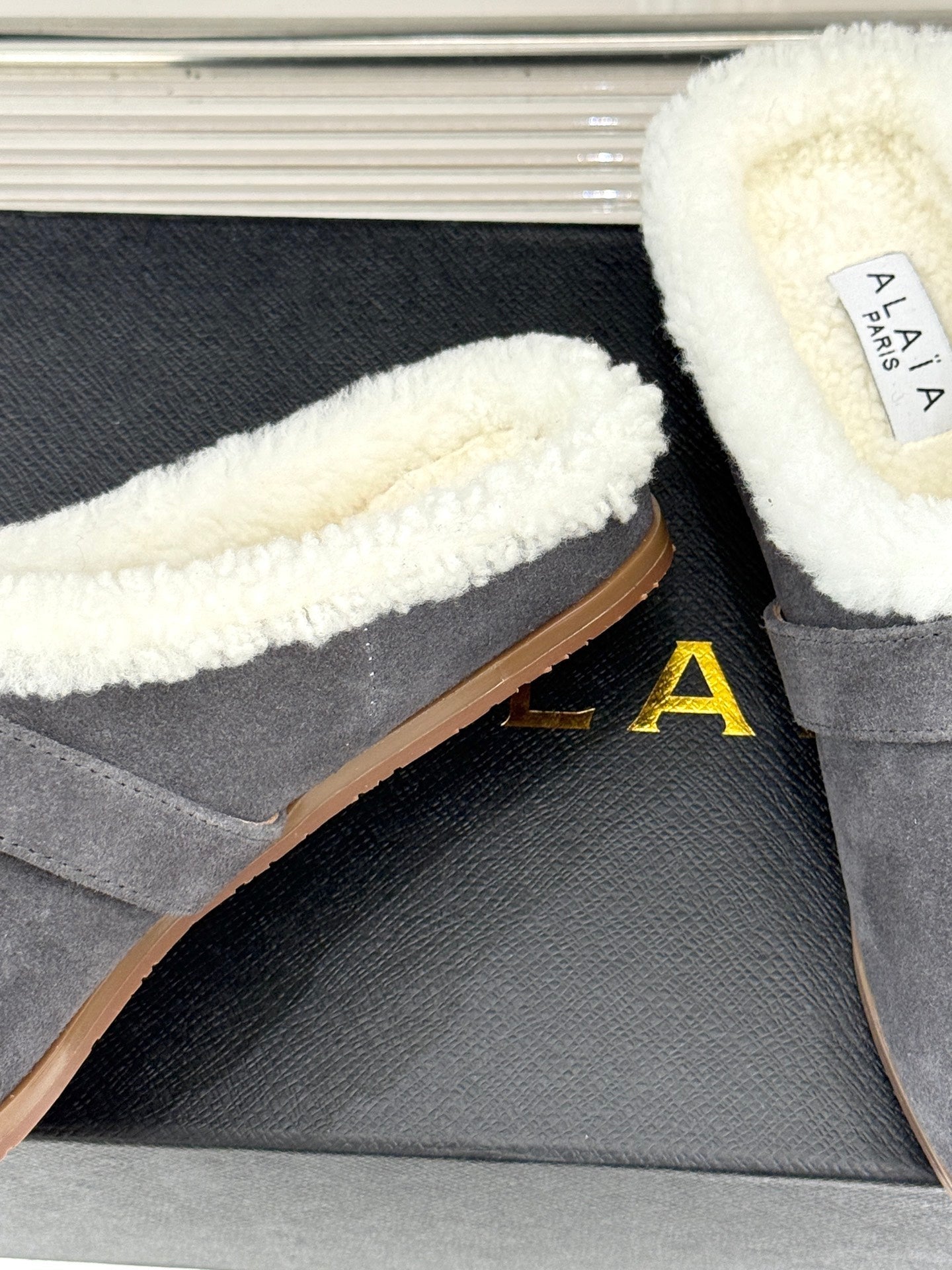 Alaia 25WF slippers belt buckle charcoal grey suede wool 472230