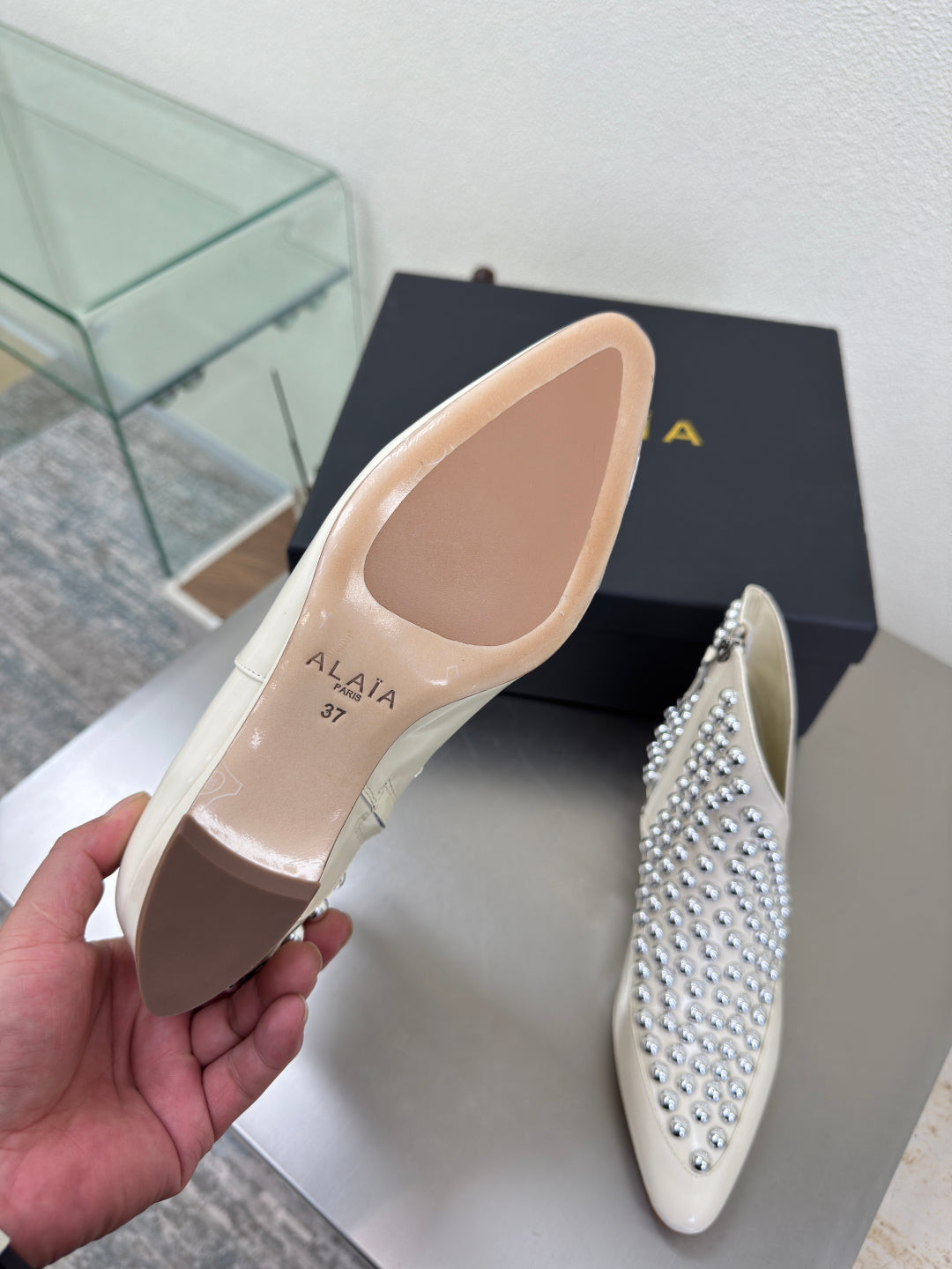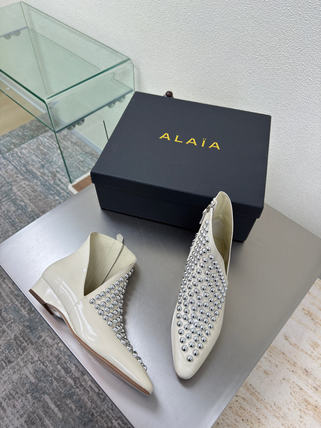 ALAIA Rivet ankle boots ivory cowhide leather 471092