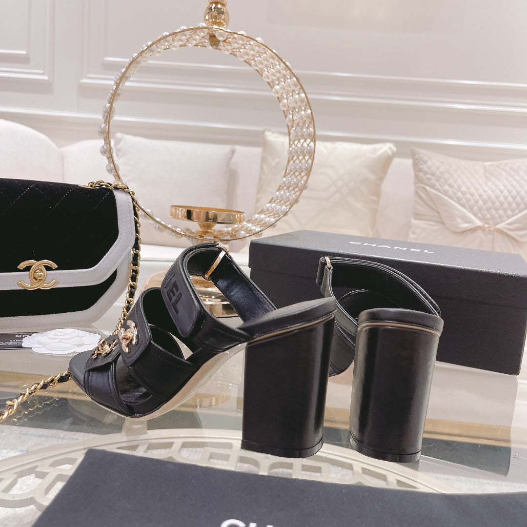 CC 25C Three Strap Sandal Mule High Heel Black Sheepskin 213348