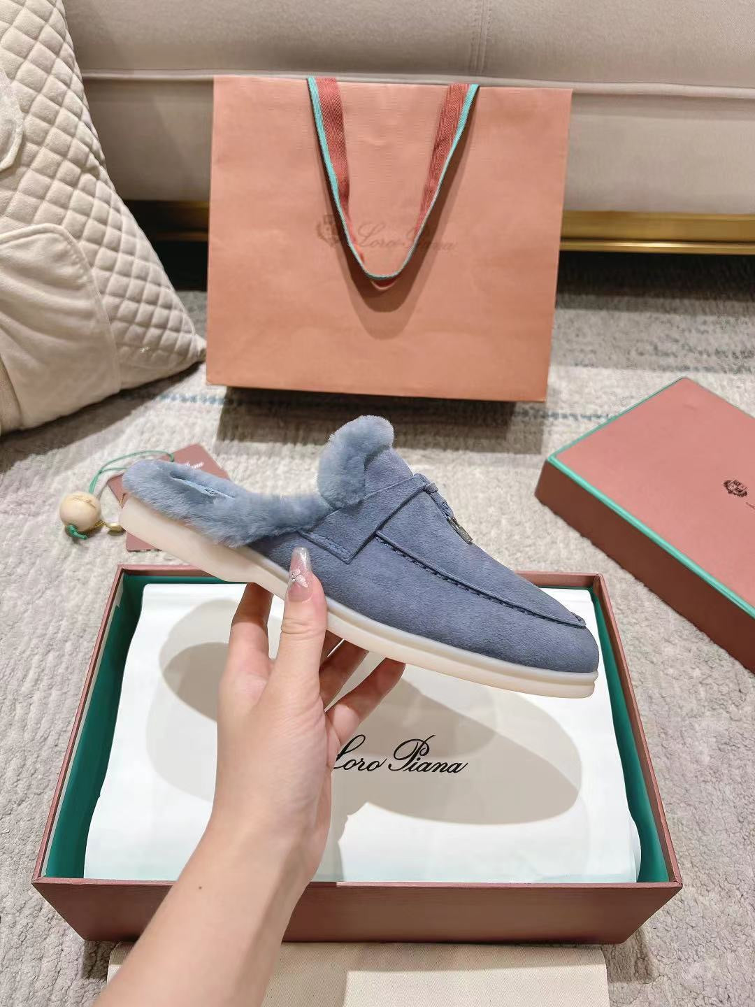 LP Charms Walk Babouche Loafer Pigeon Blue Suede With Rabbit Fur Lining 206238