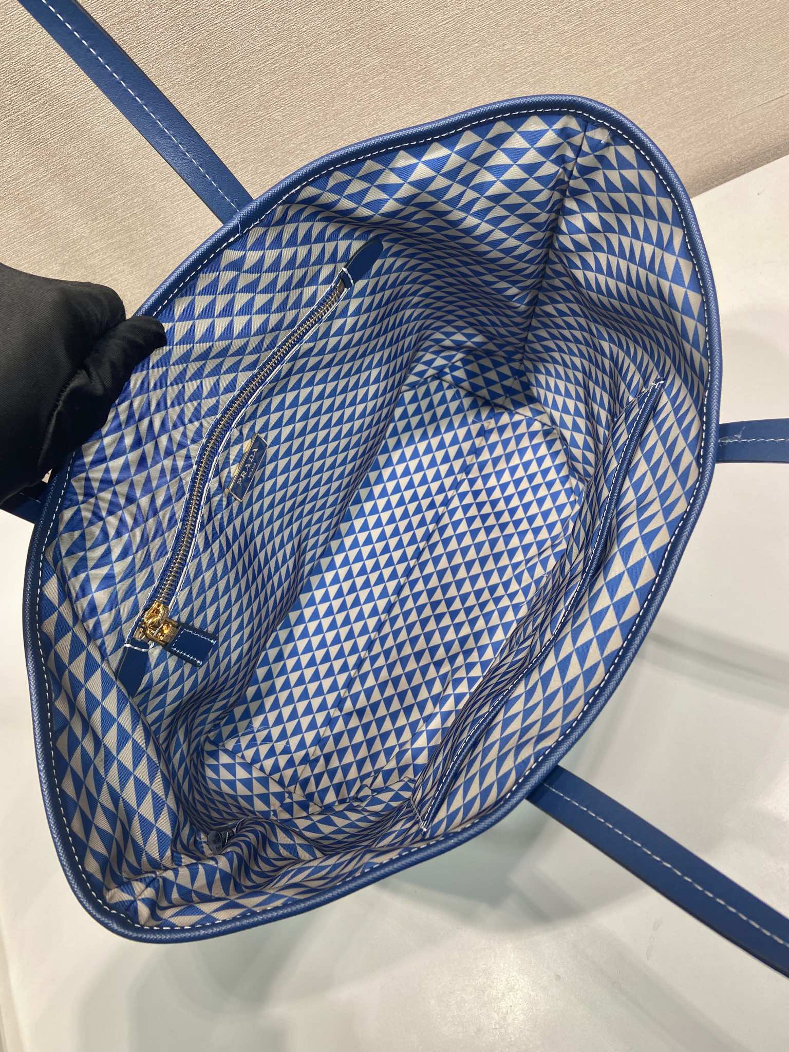 TOTE BAG 33 IN BLUE MIX WHITE TRIANGLE PATTERN EMBROIDERED FABRIC
