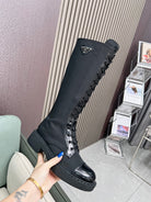 LACE-UP KNEE BOOTS IN BLACK DENIM AND SHEEPSKIN LINING