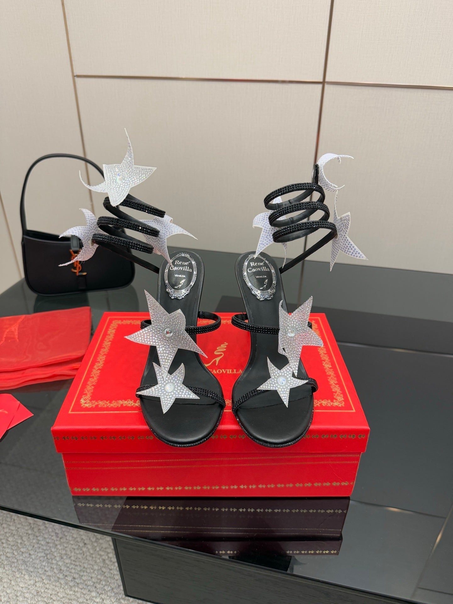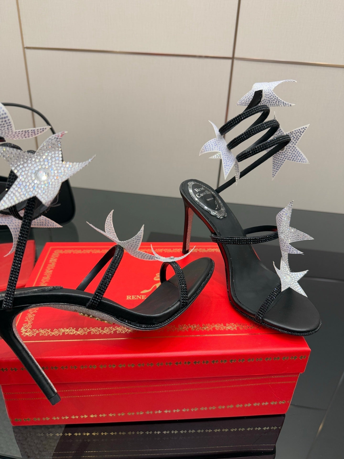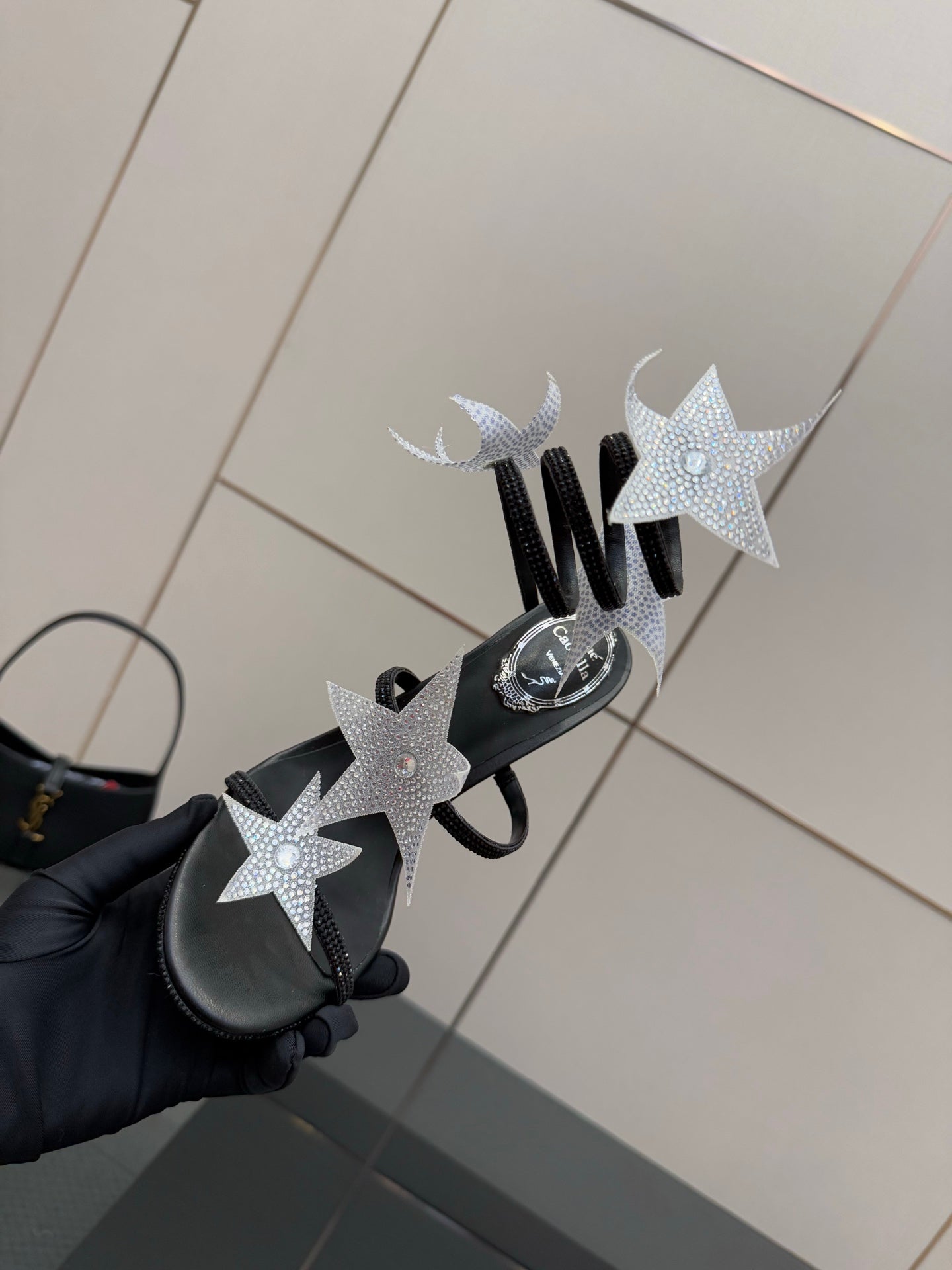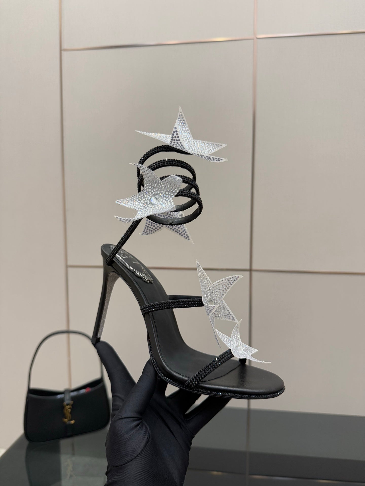 RC Sandals 9.5cm Black Silver Rhinestone Silk 302582