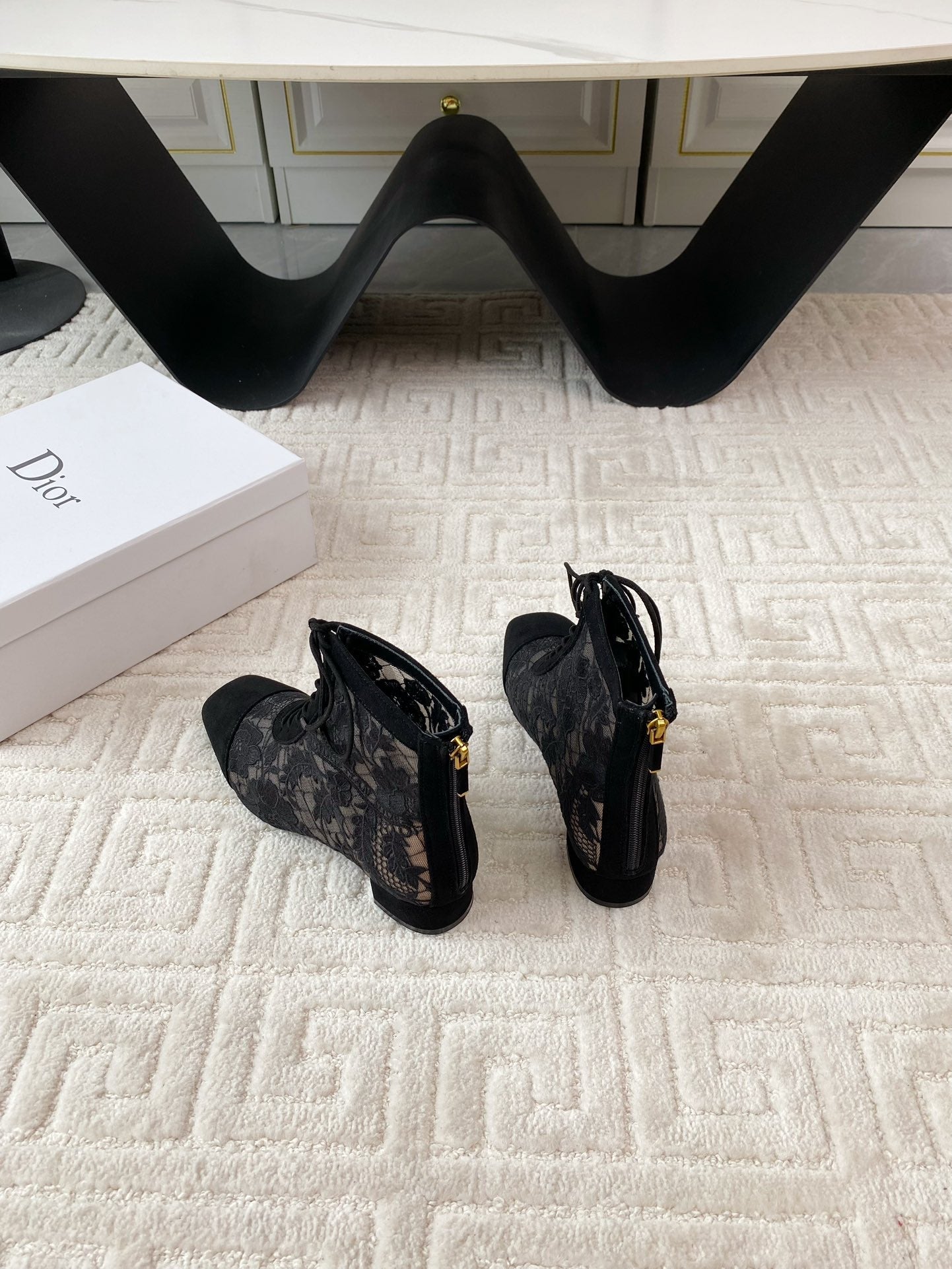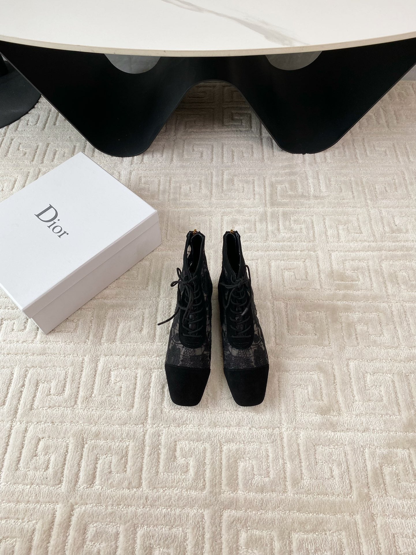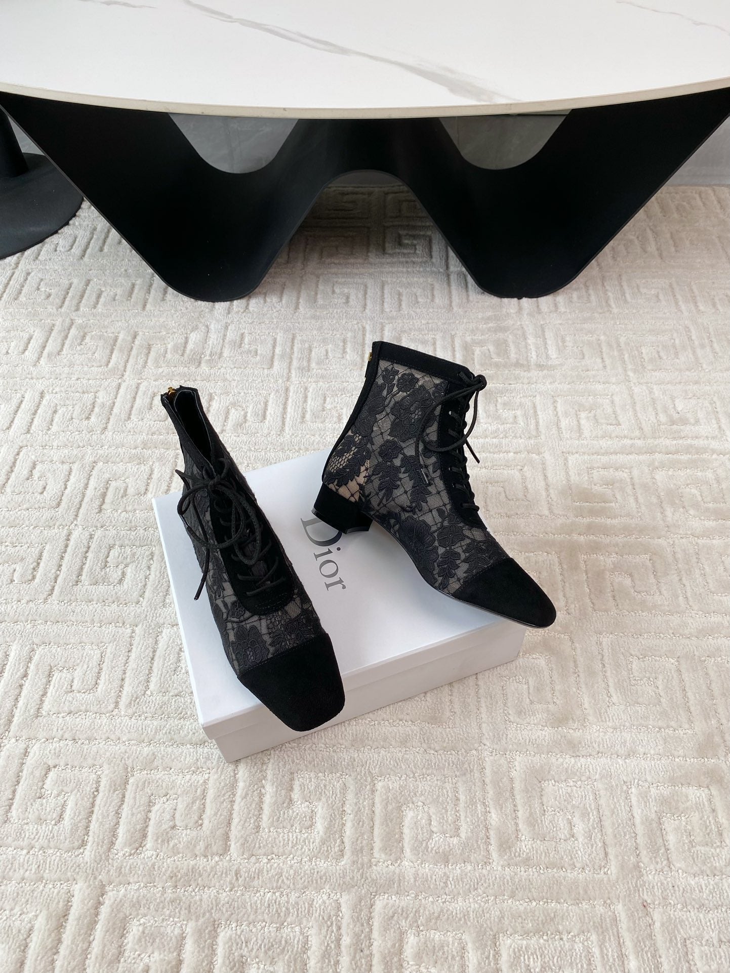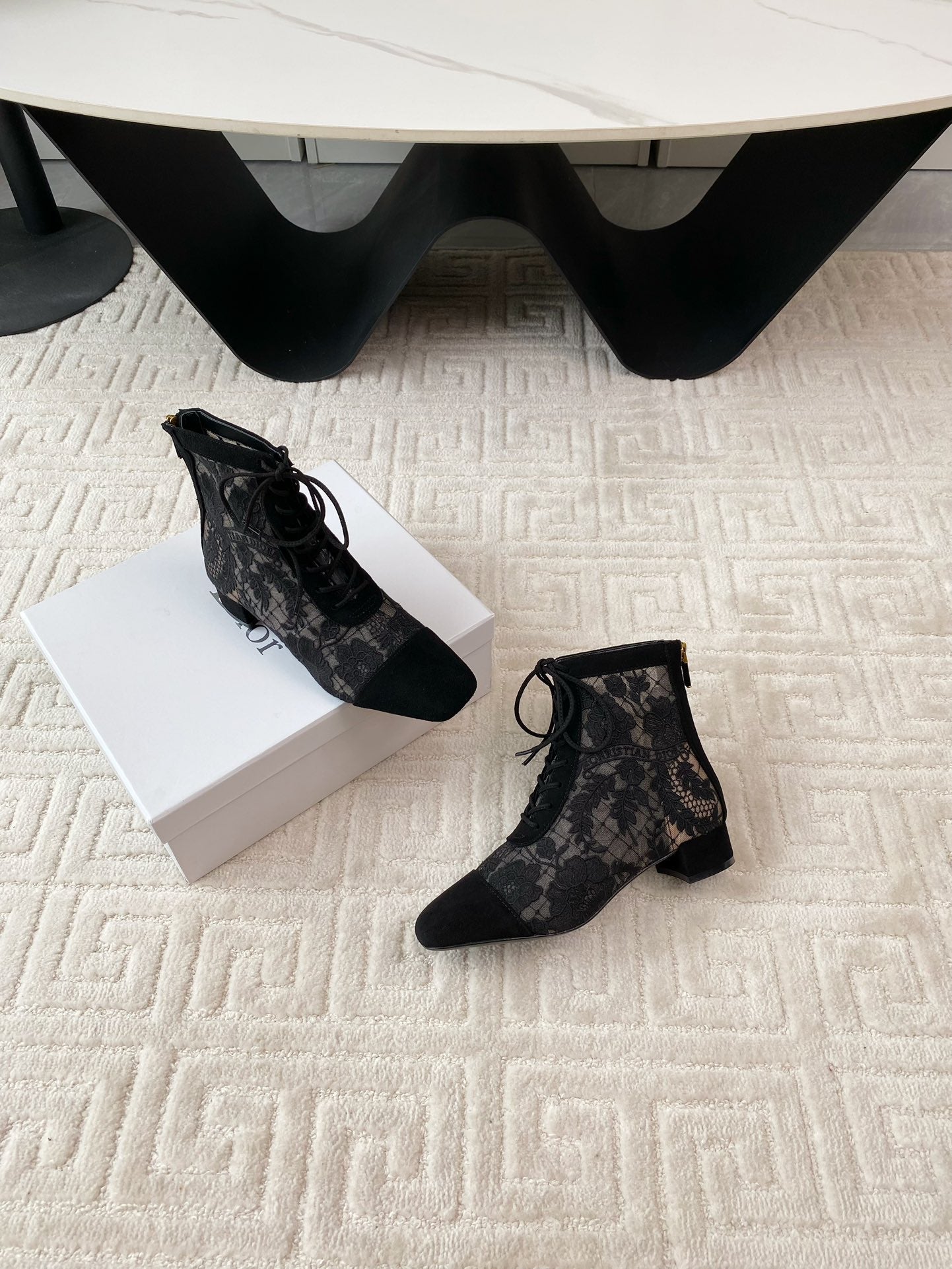 CD Naughtily-D Heeled Ankle Boot Black Transparent Mesh Roses Embroidery And Suede