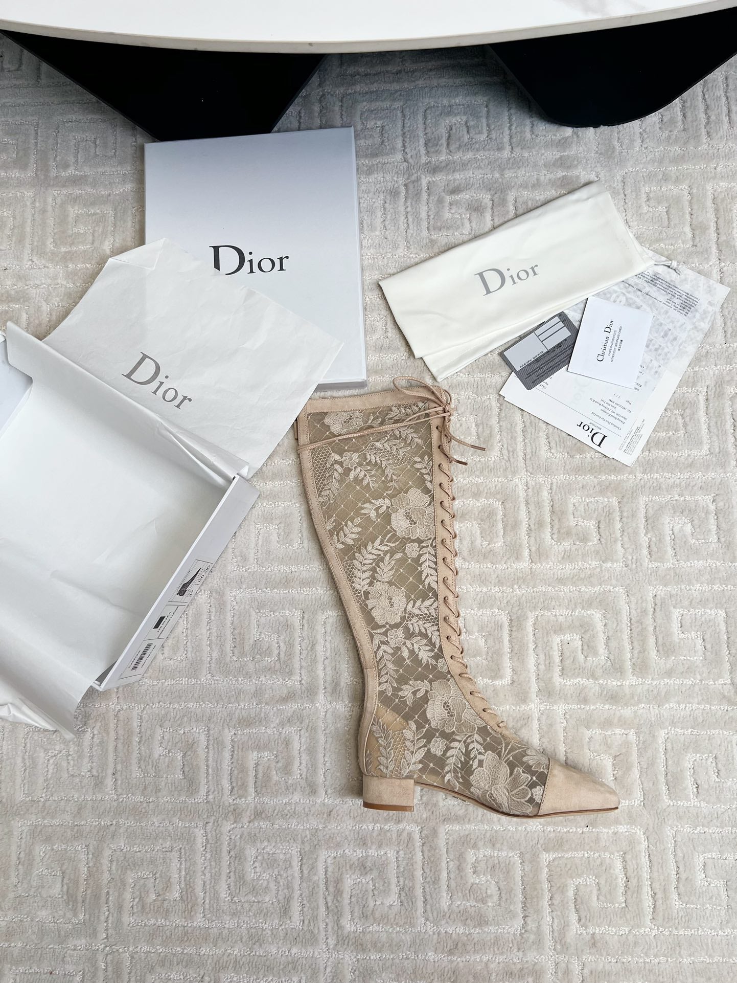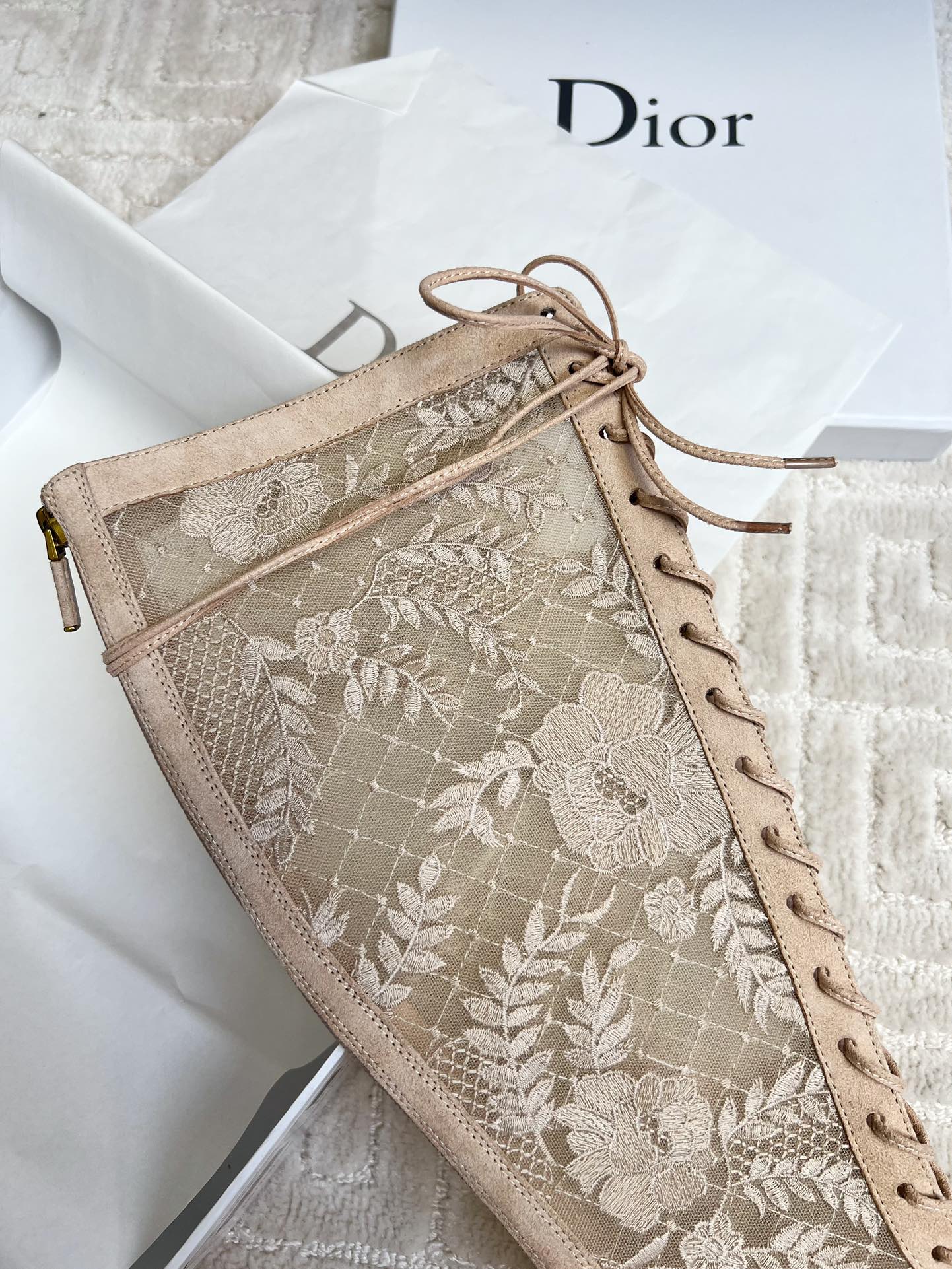 CD Naughtily-D Heeled High Boots Beige Transparent Mesh Roses Embroidery And Suede