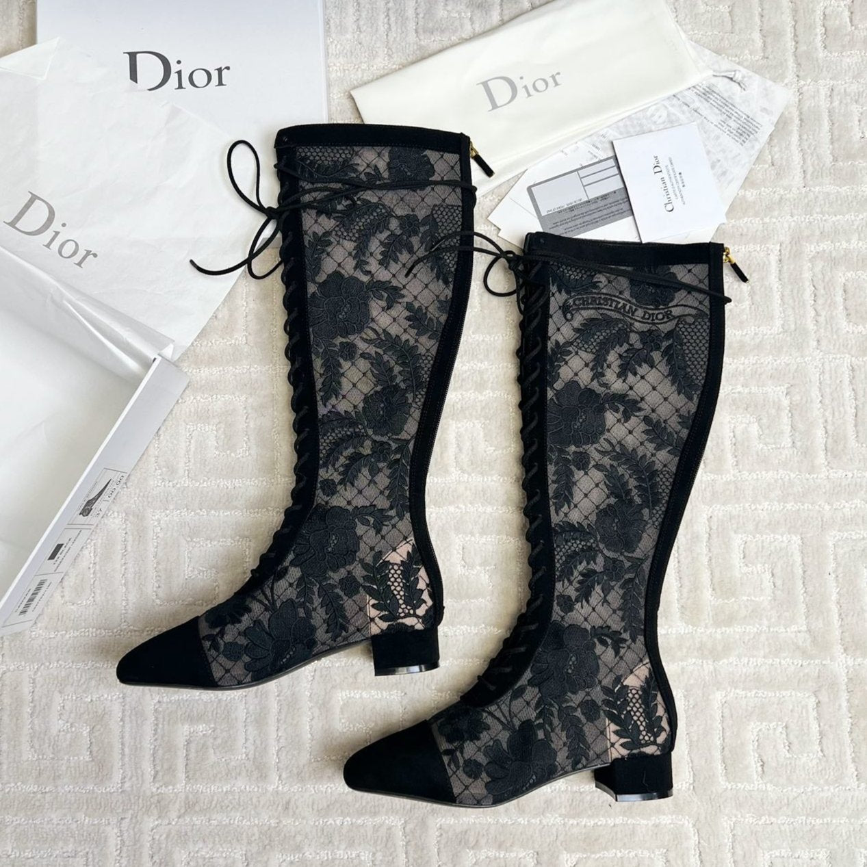 CD Naughtily-D Heeled High Boots Black Transparent Mesh Roses Embroidery And Suede