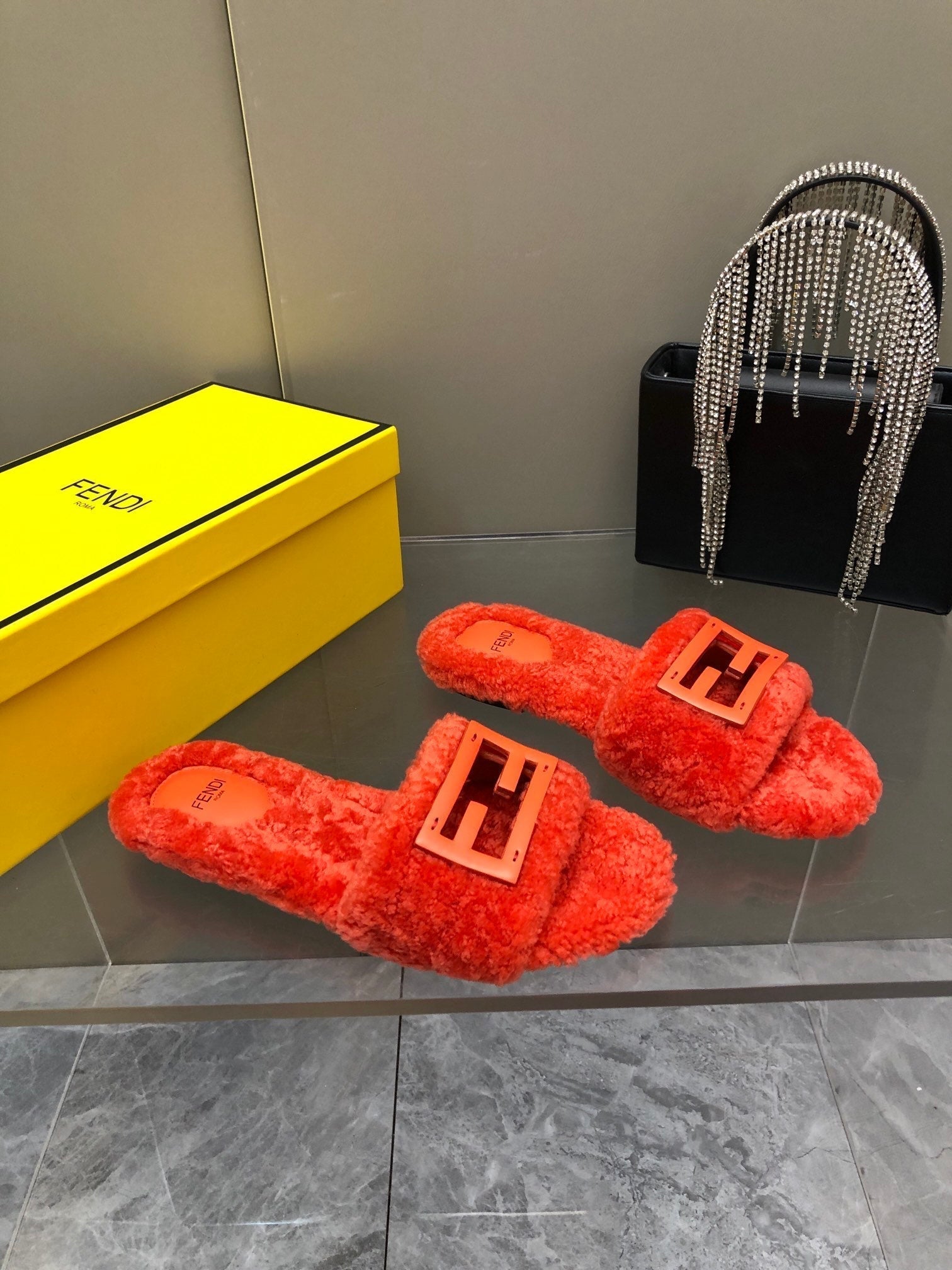 FENDI BAGUETTE SLIDE SLIPPERS IN CHERRY RED WOOL