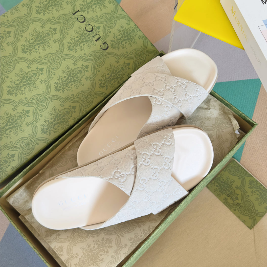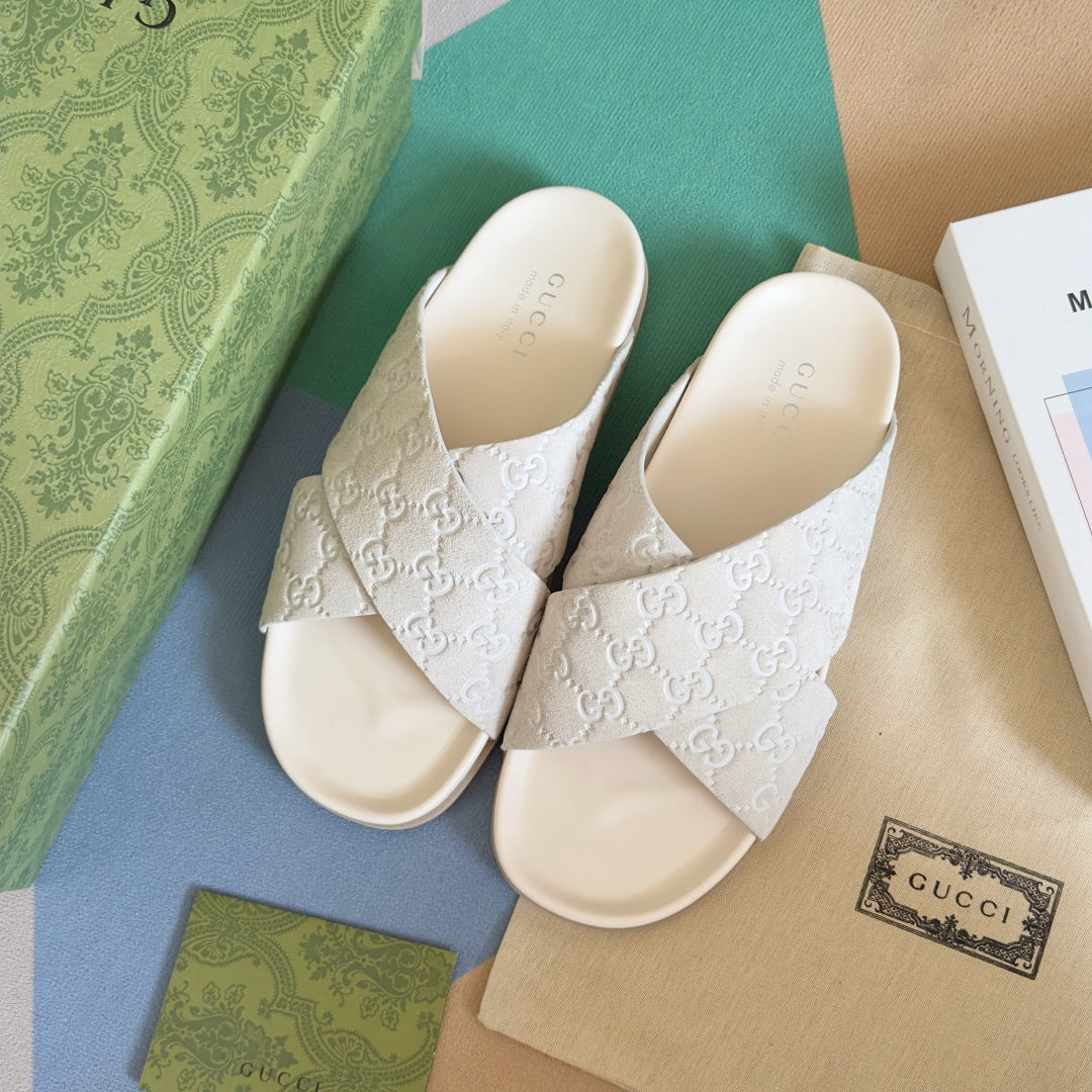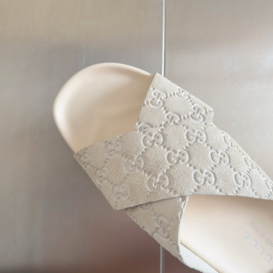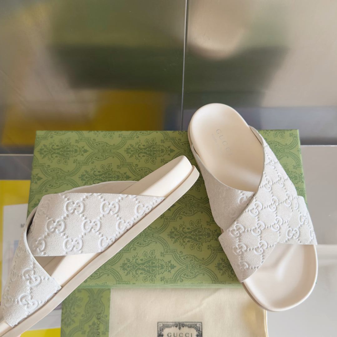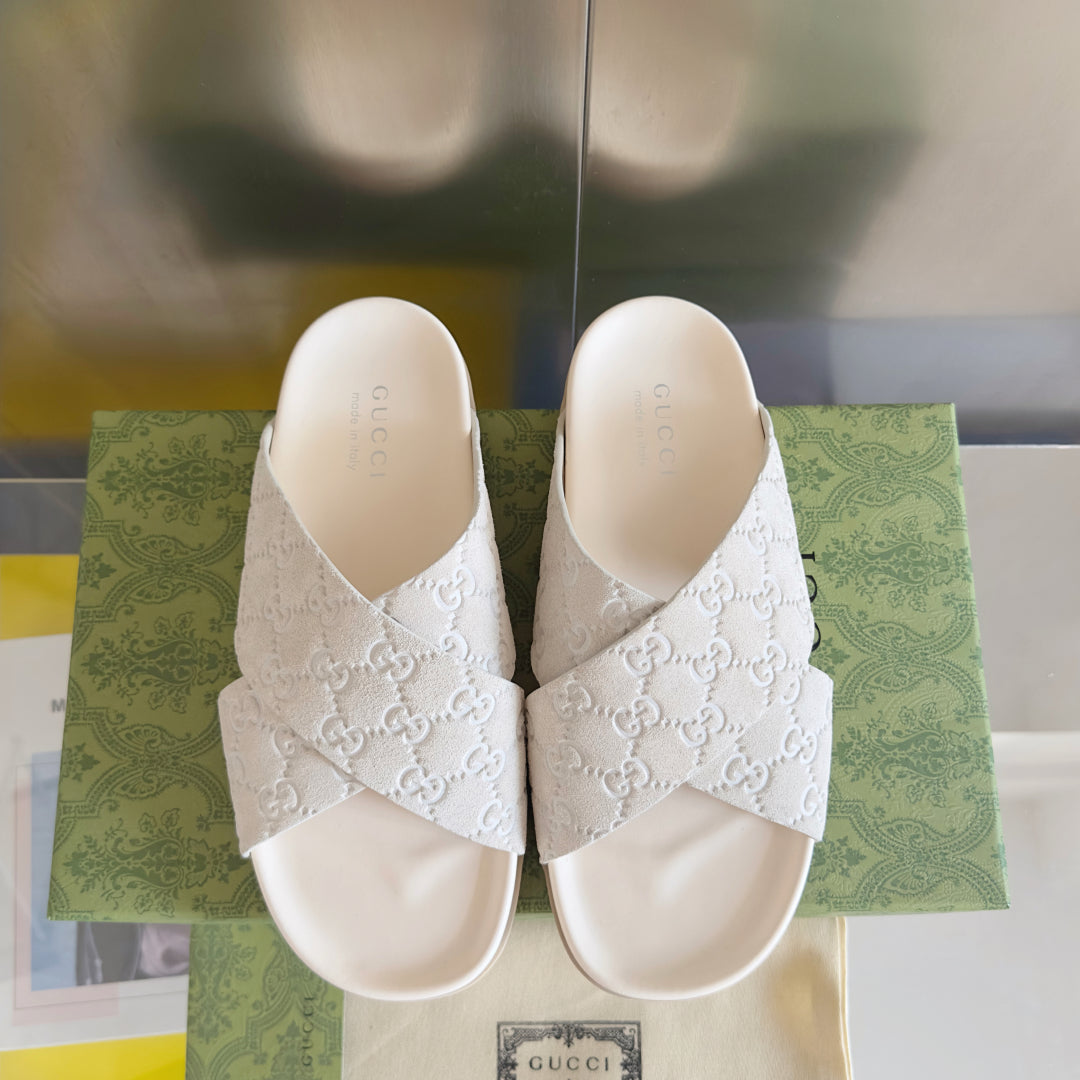 GG Men's Slide White Embossed Suede 595711