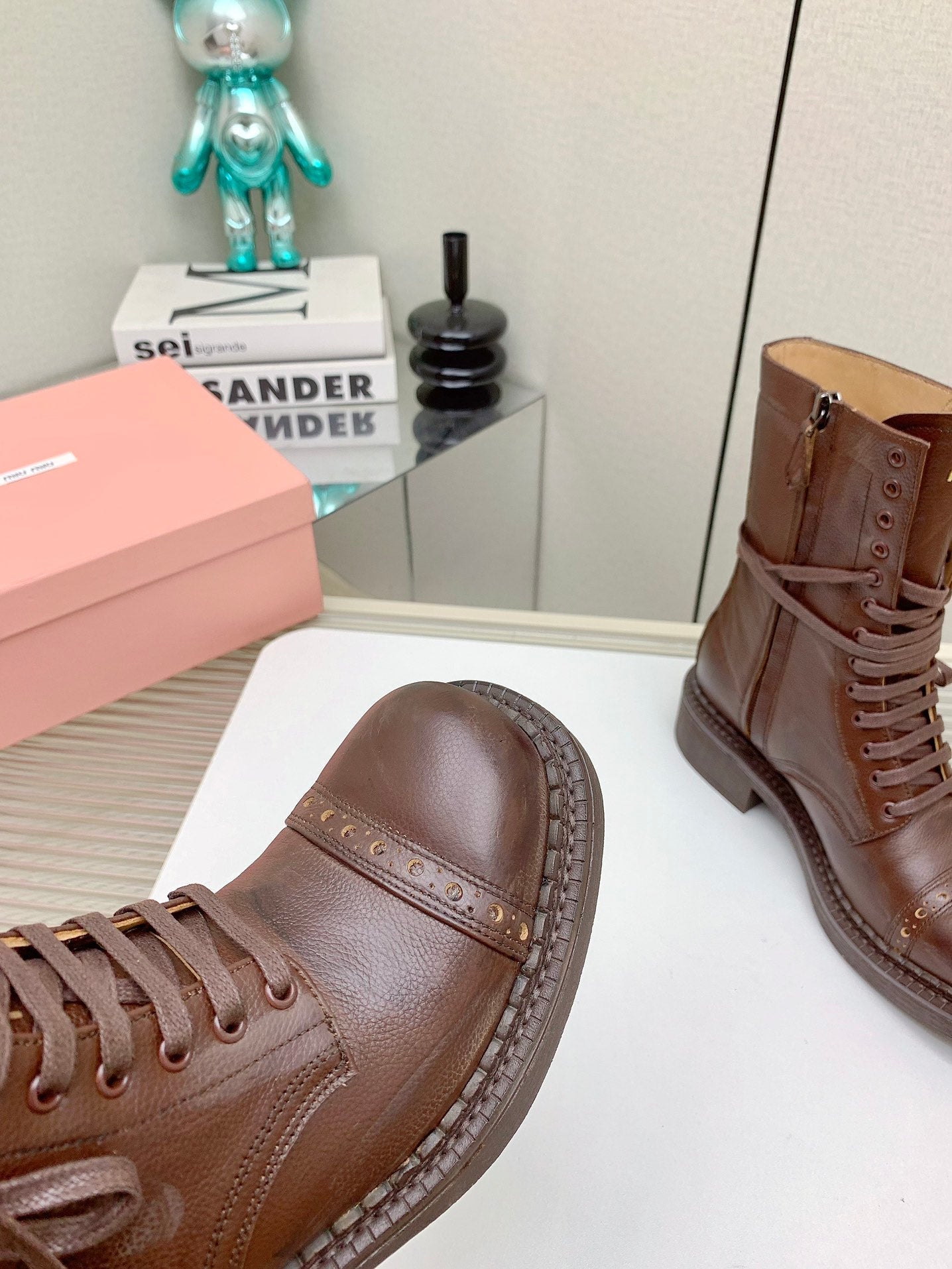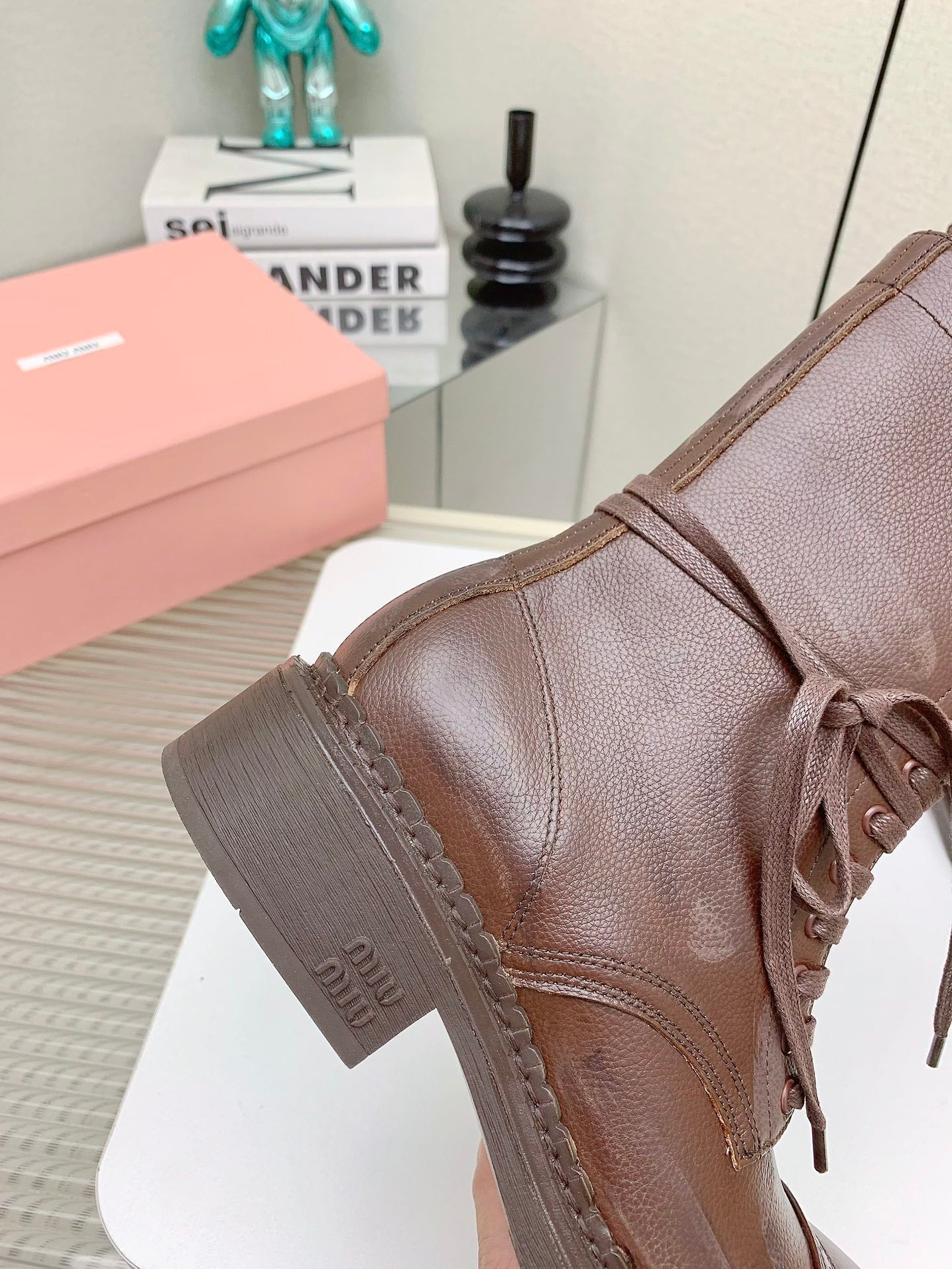 Miu Leather Laced Booties Chestnut Brown Cowhide