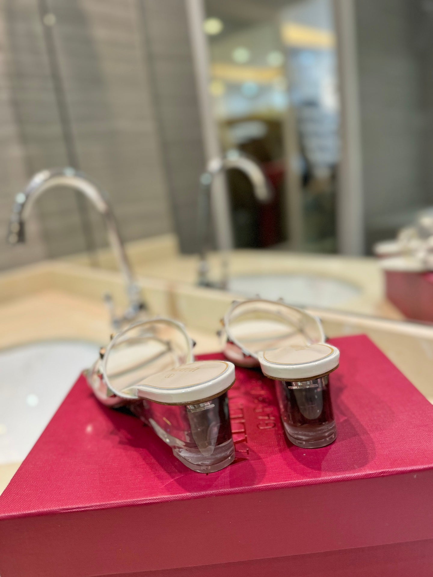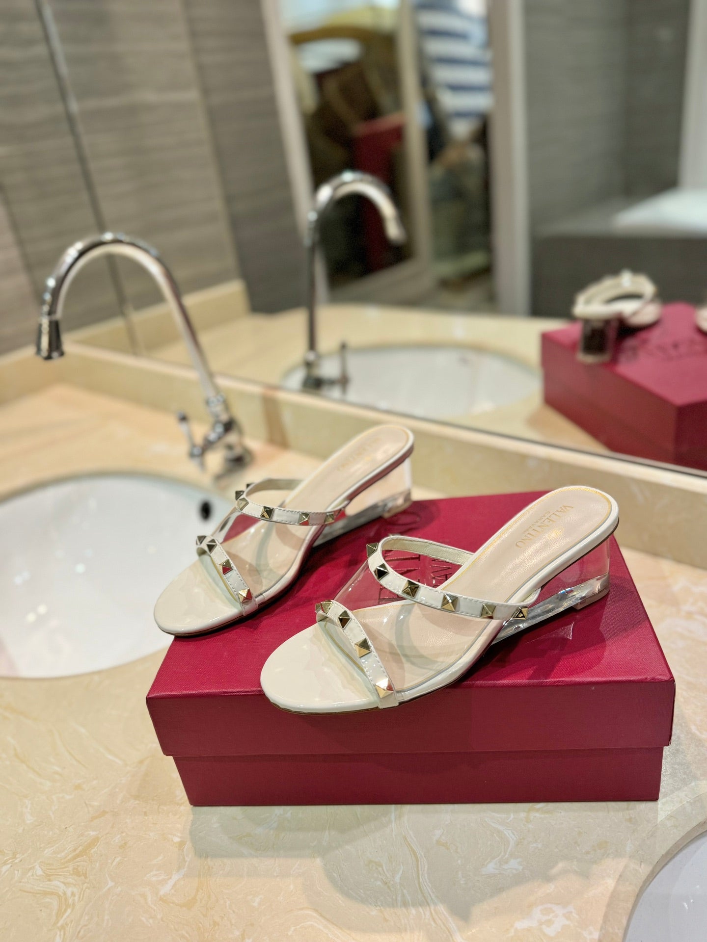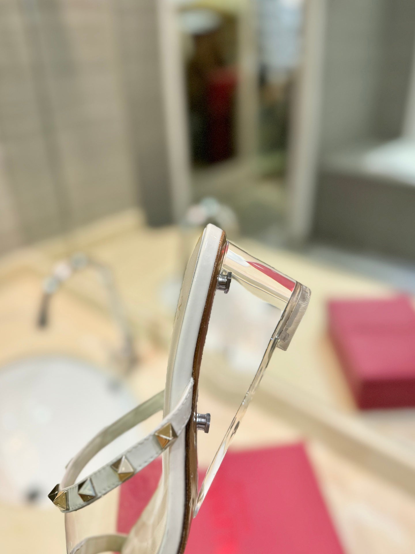ROCKSTUD MULE SANDALS IN WHITE CALFSKIN AND TRANSPARENT PVC FILM