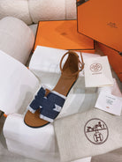 • Material: Sandal in Clafskin, Denim with straight cut edges, "H" cut-out detail and thin ankle strap.