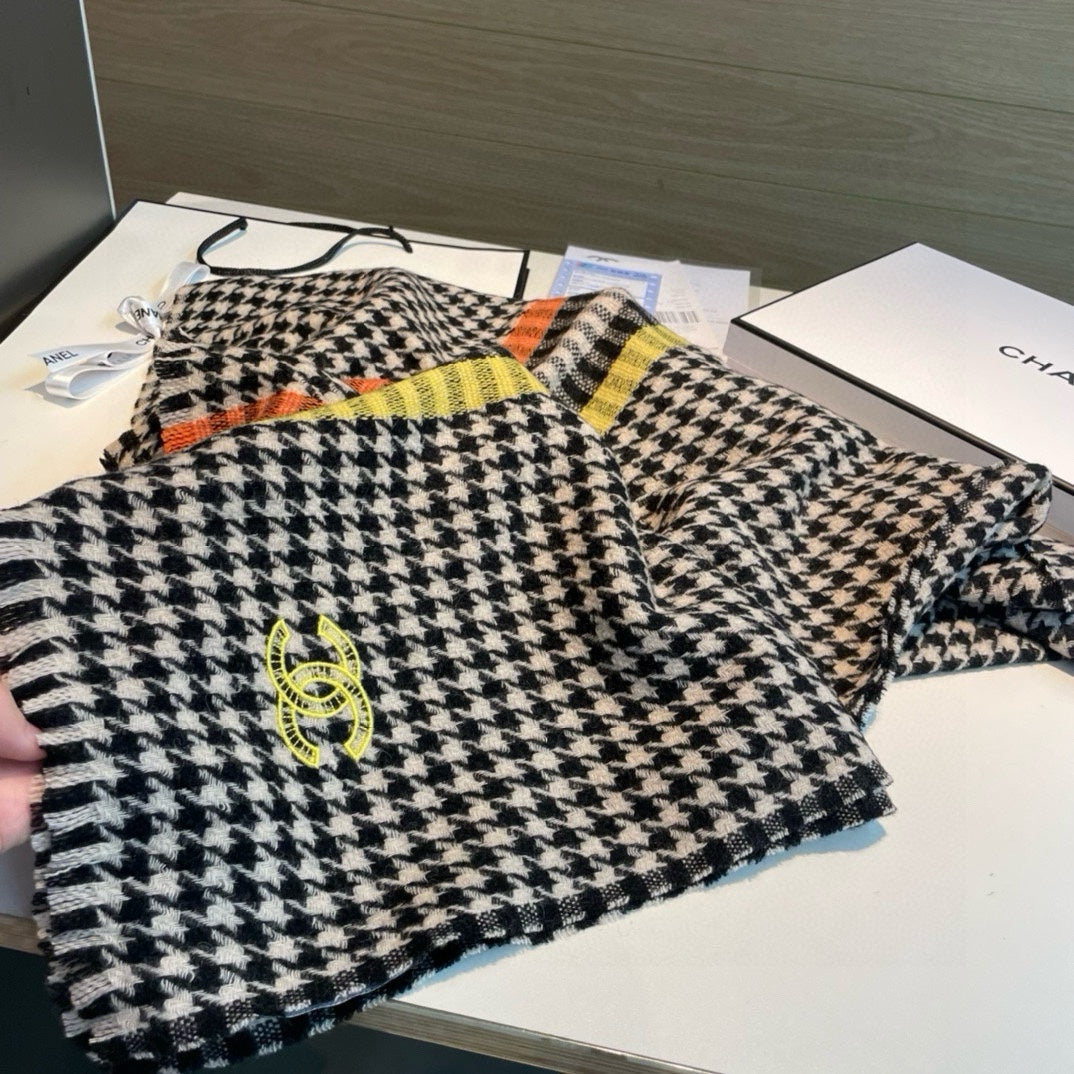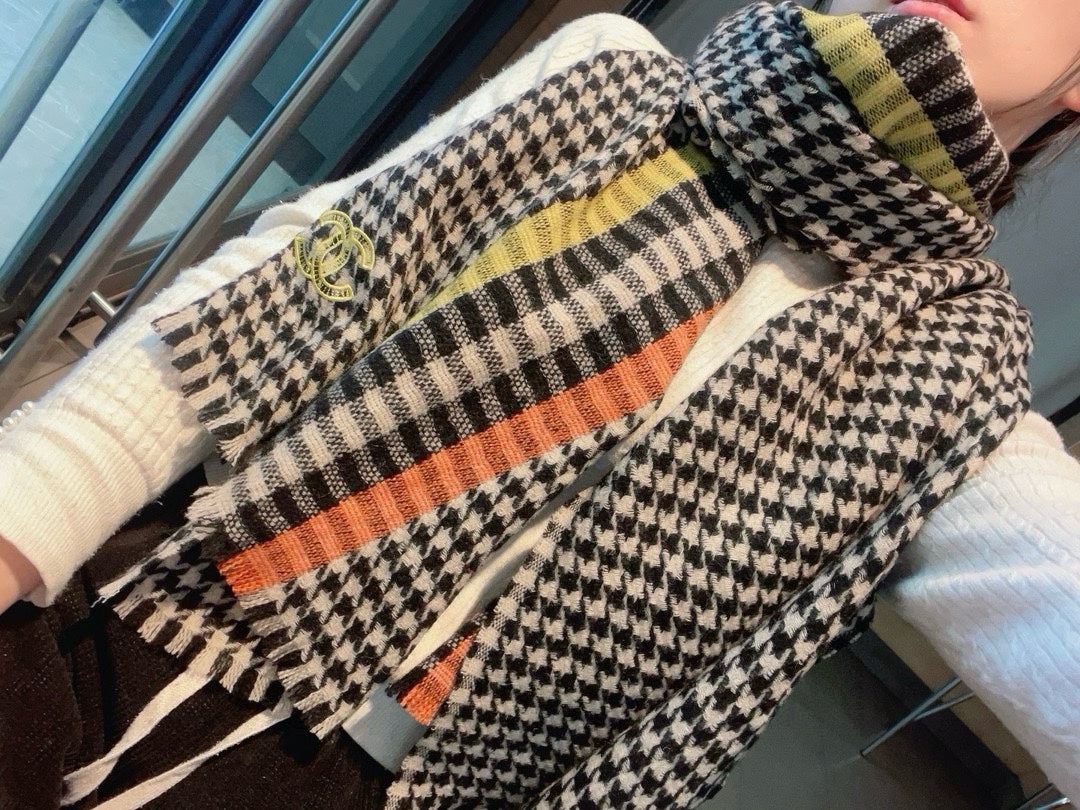 CC Scarf 190 CM In Black White Mix Orange Yellow Serrated Shape Cashmere 387912