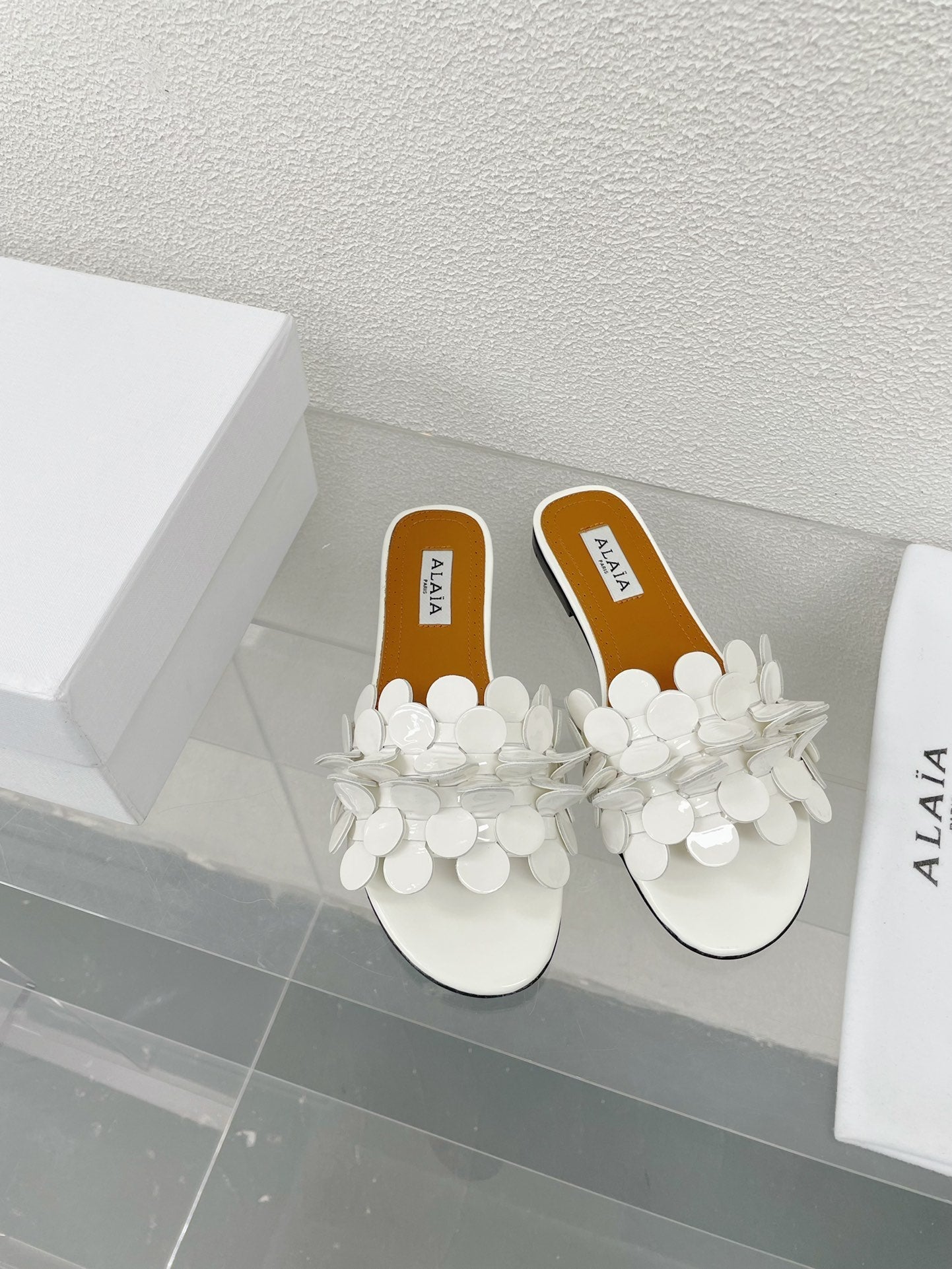 ALAIA FLAT MULE IN WHITE GLOSSY LAMBSKIN