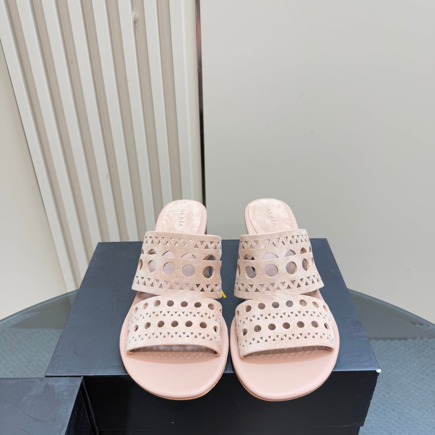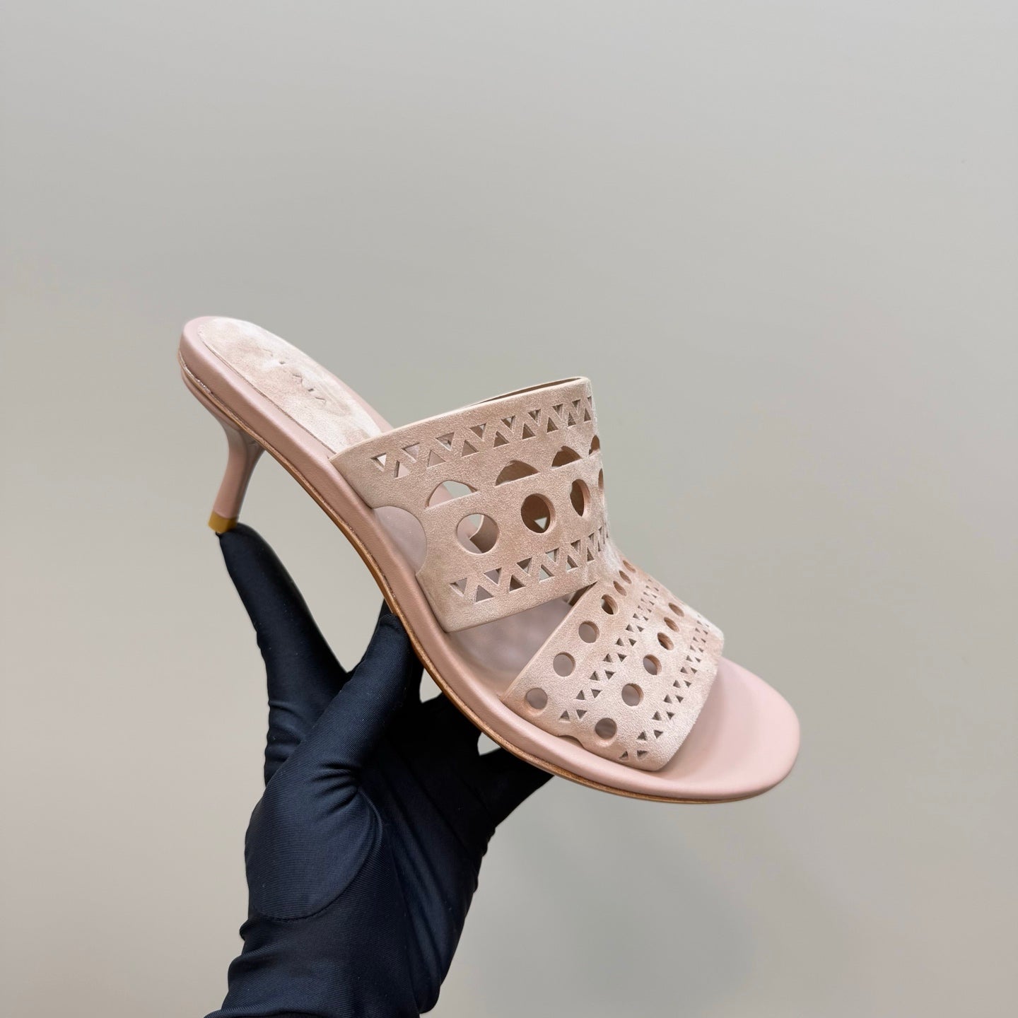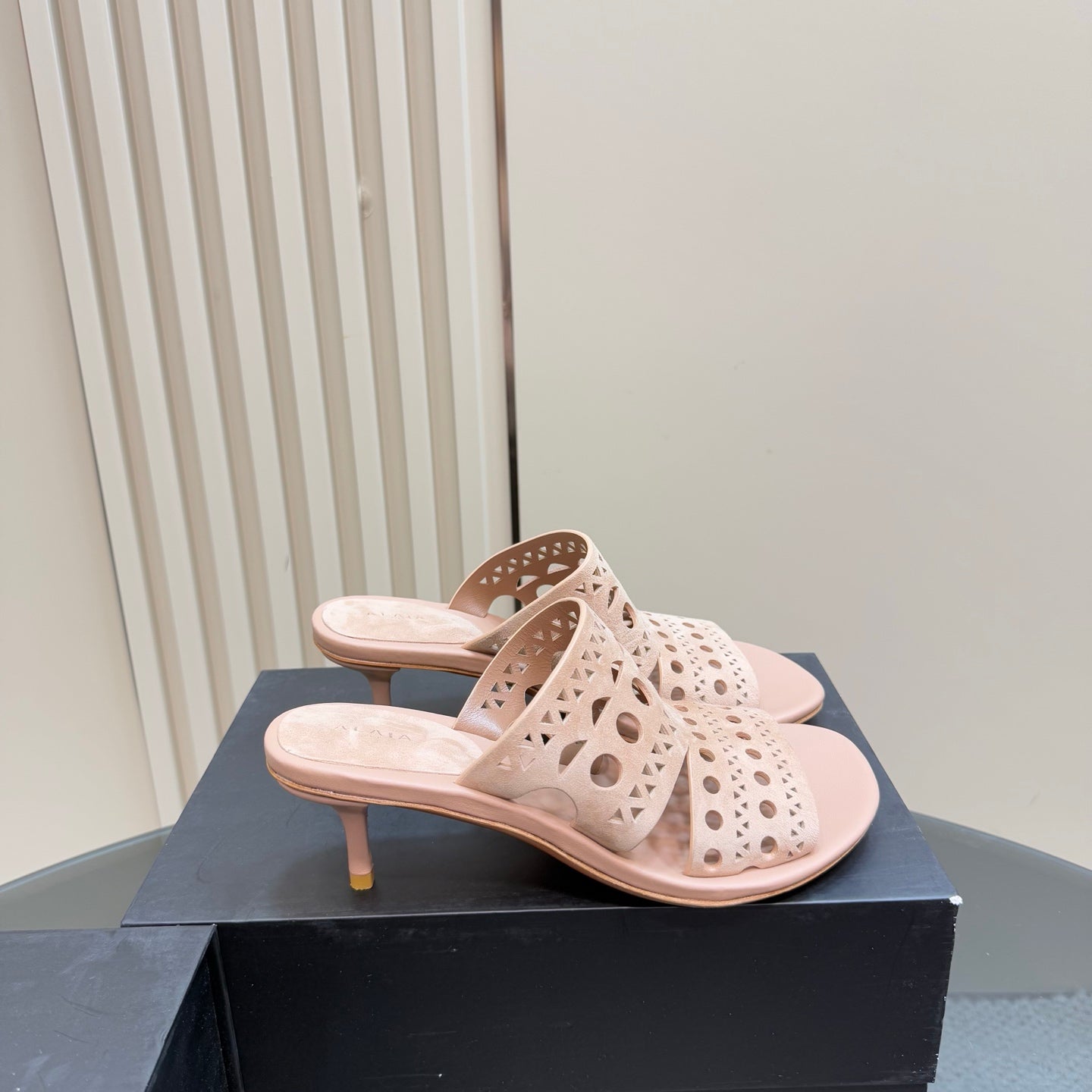 Alaia Vienne Cutout Kitten-Heel Slide Sandals Pink Sheepskin 299665