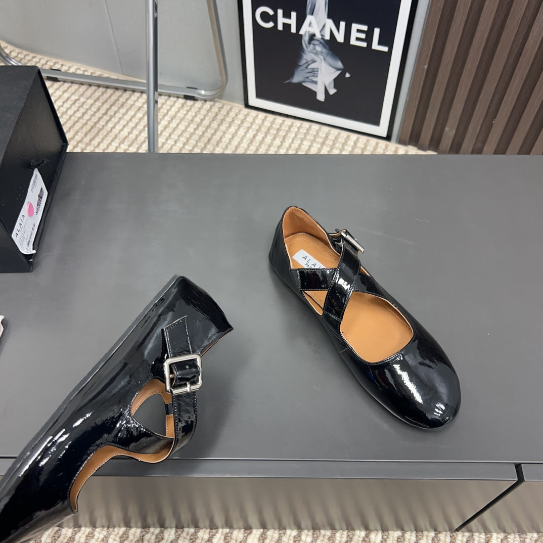 Alaila Criss Cross Ballet Flats In Black Glossy Calfskin 996027